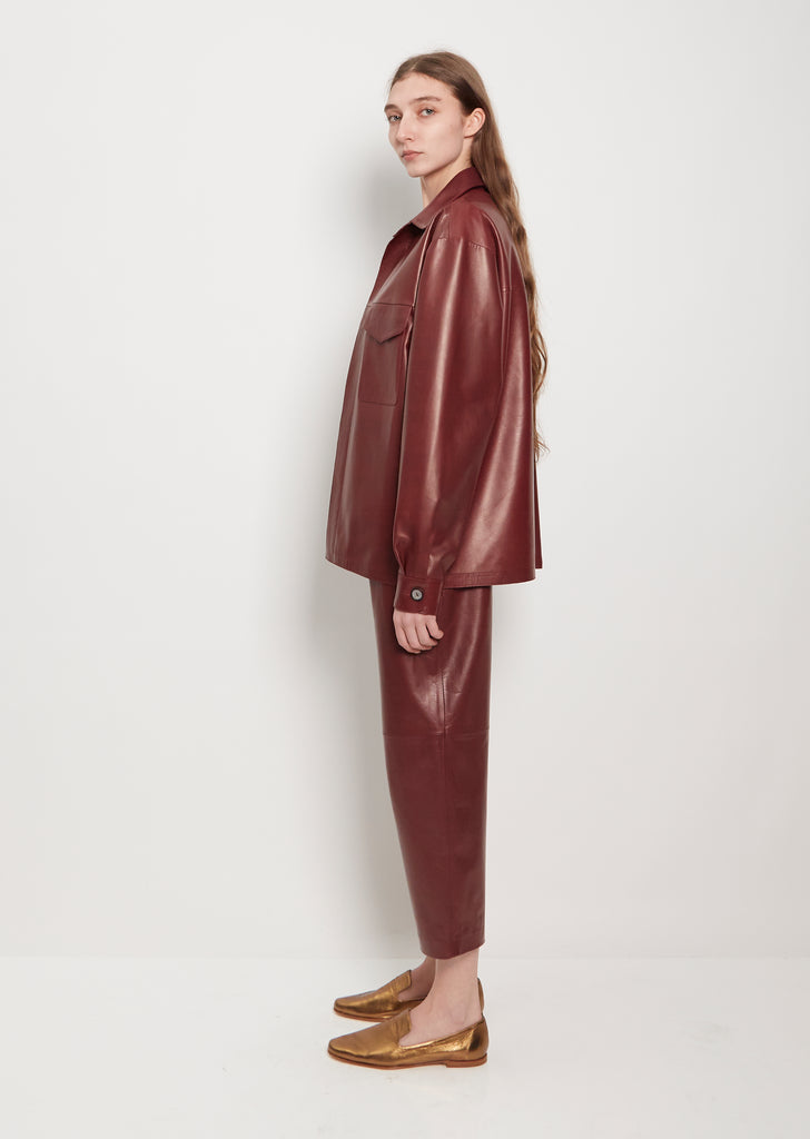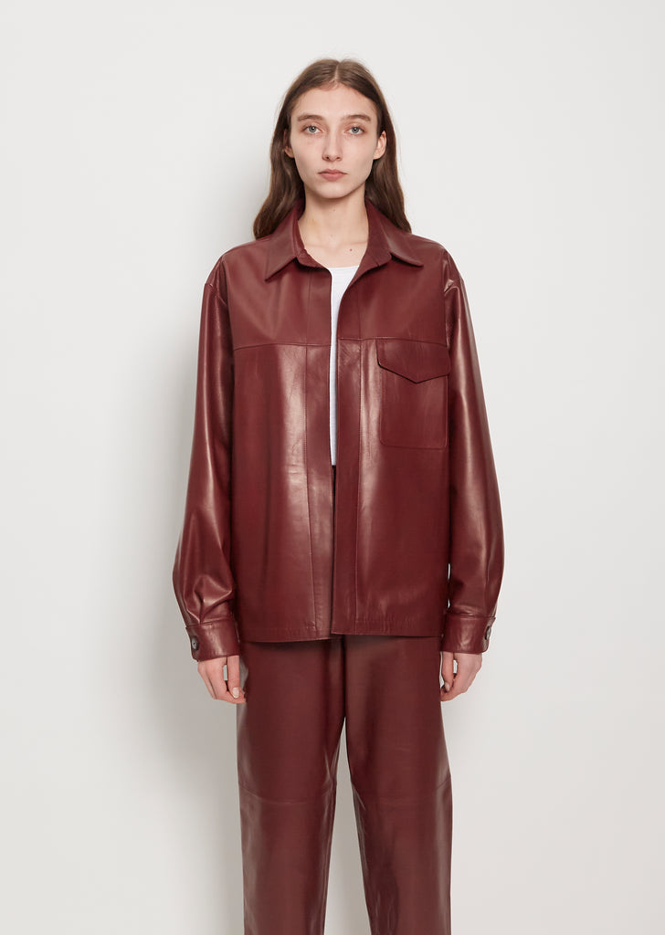 Dušan vino open front, short jacket with a spread collar in smooth lambskin leather. Features a single flap patch pocket, single button cuffs, and straight hem. Lined in suede. Relaxed, straight fit.