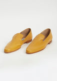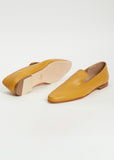 Dušan ambra moccasin with an almond toe and notched vamp in soft lambskin leather. Fully lined in contrast tan leather and set on a low stacked heel.