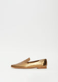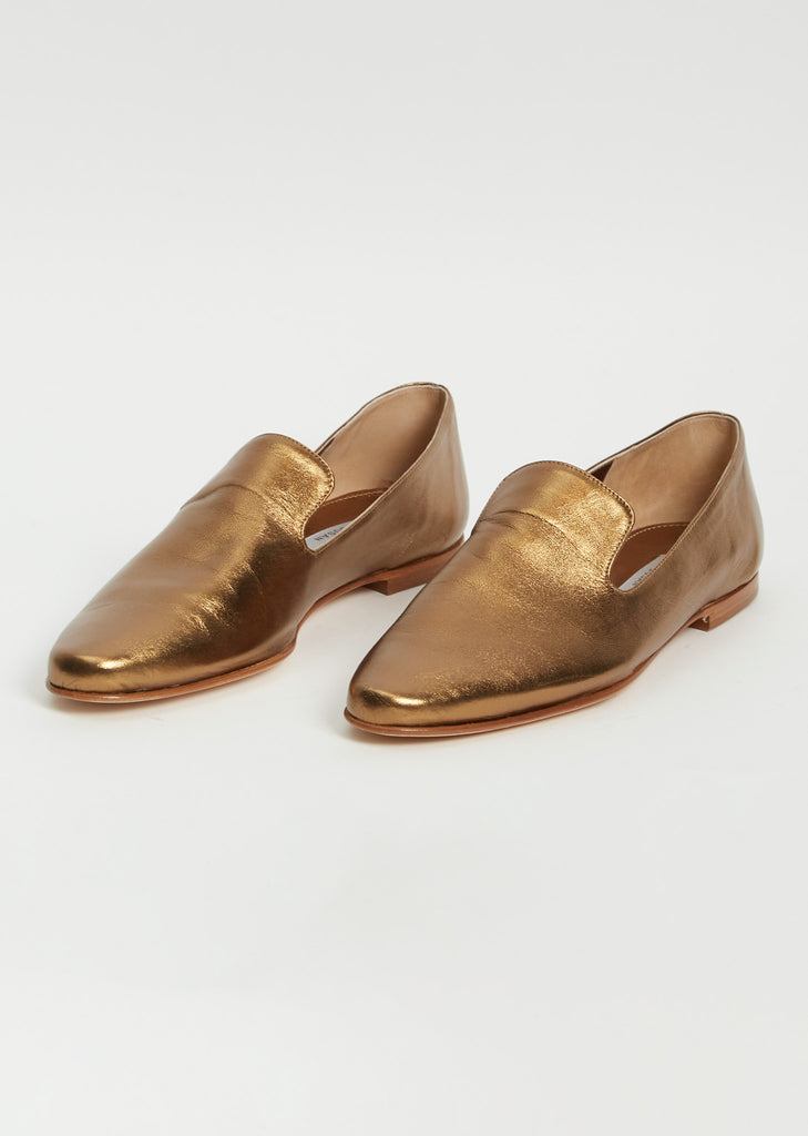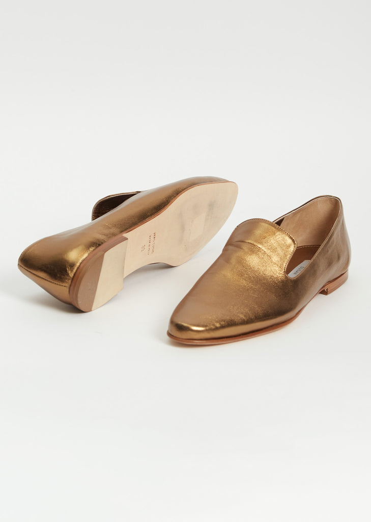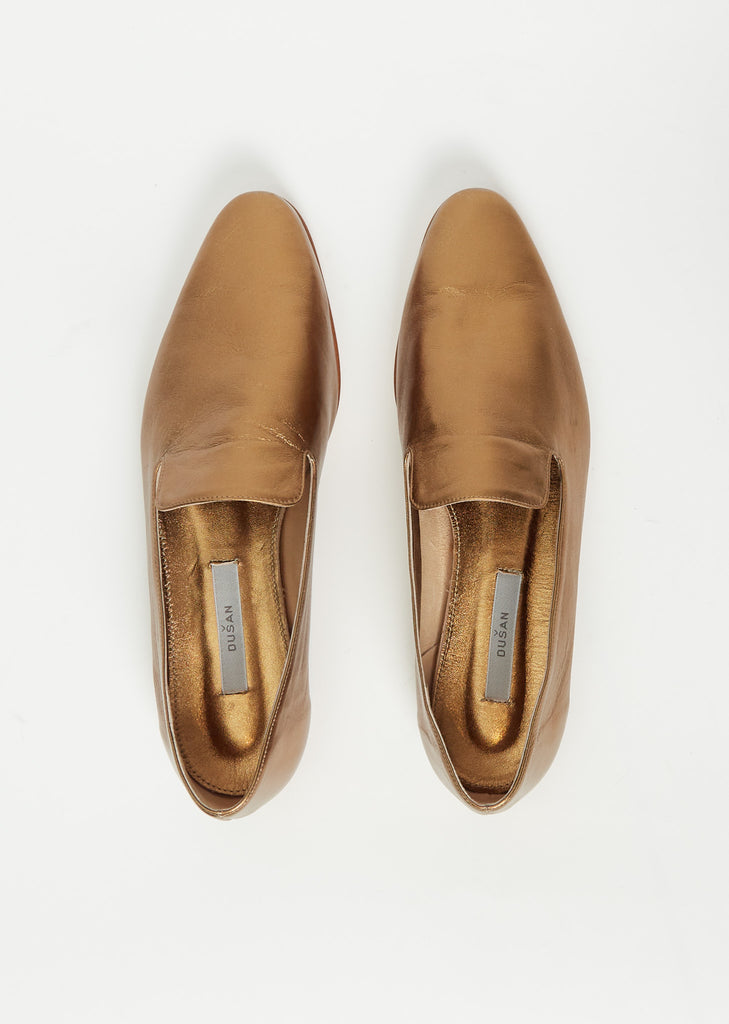 Dušan oro moccasin with an almond toe and notched vamp in soft lambskin leather. Fully lined in tonal metallic leather and set on a low stacked heel.