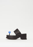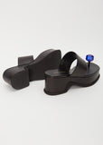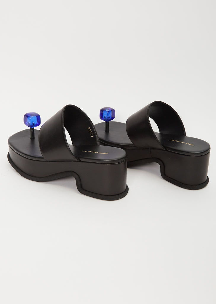 Dries Van Noten black platform sandal detailed with a sculptural blue bead toe-splitter in leather. Fully lined in tonal leather and set on a tonal leather covered stacked square heel with gripped tonal tread.