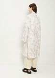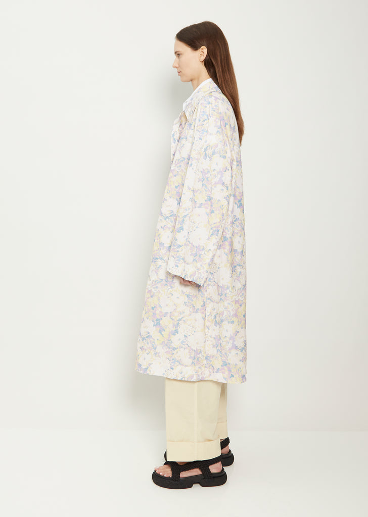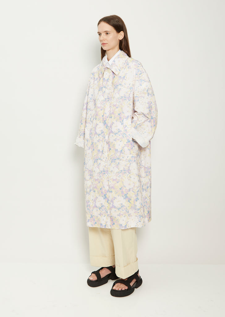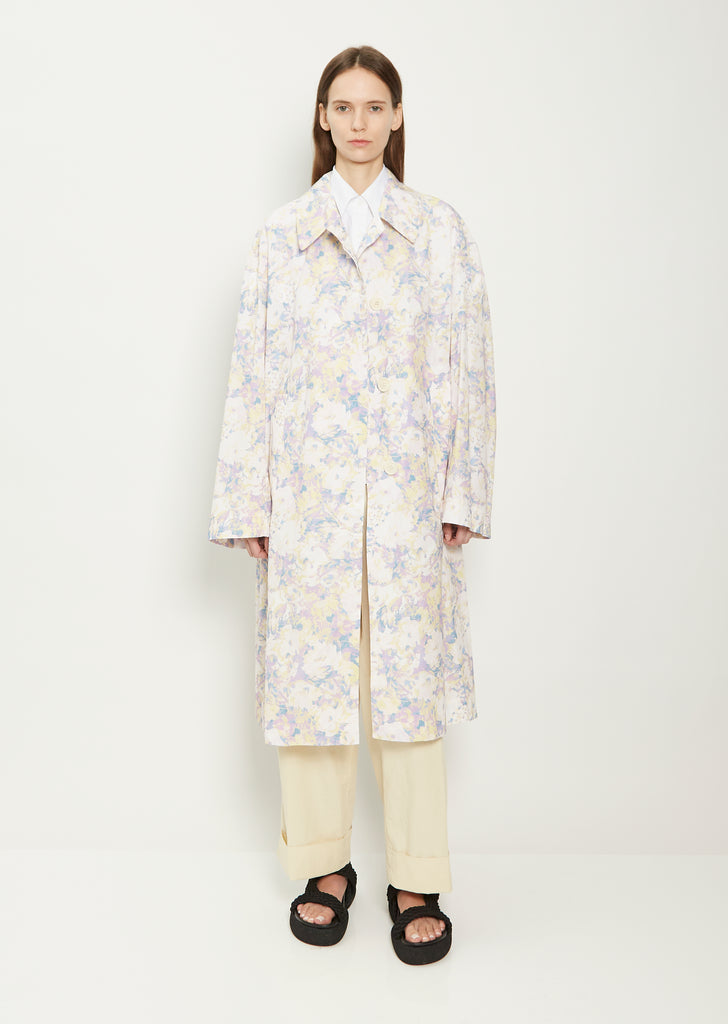Dries Van Noten lilac floral print, single-breasted trench coat in lightweight cotton blend fabric. Features a spread collar, dropped shoulders, angled side pockets, and a concealed button front closure. Oversized fit.