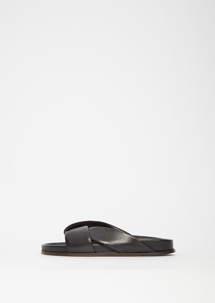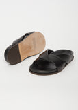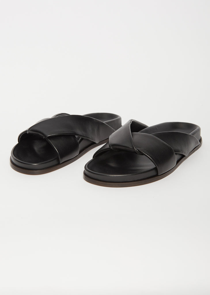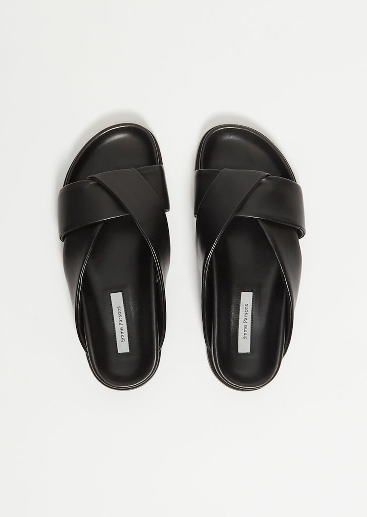 Emme Parsons black sandals with overlapping upper straps inspired by origami-folds constructed in nappa leather. Set upon a tonal welted leather fussbett sole.