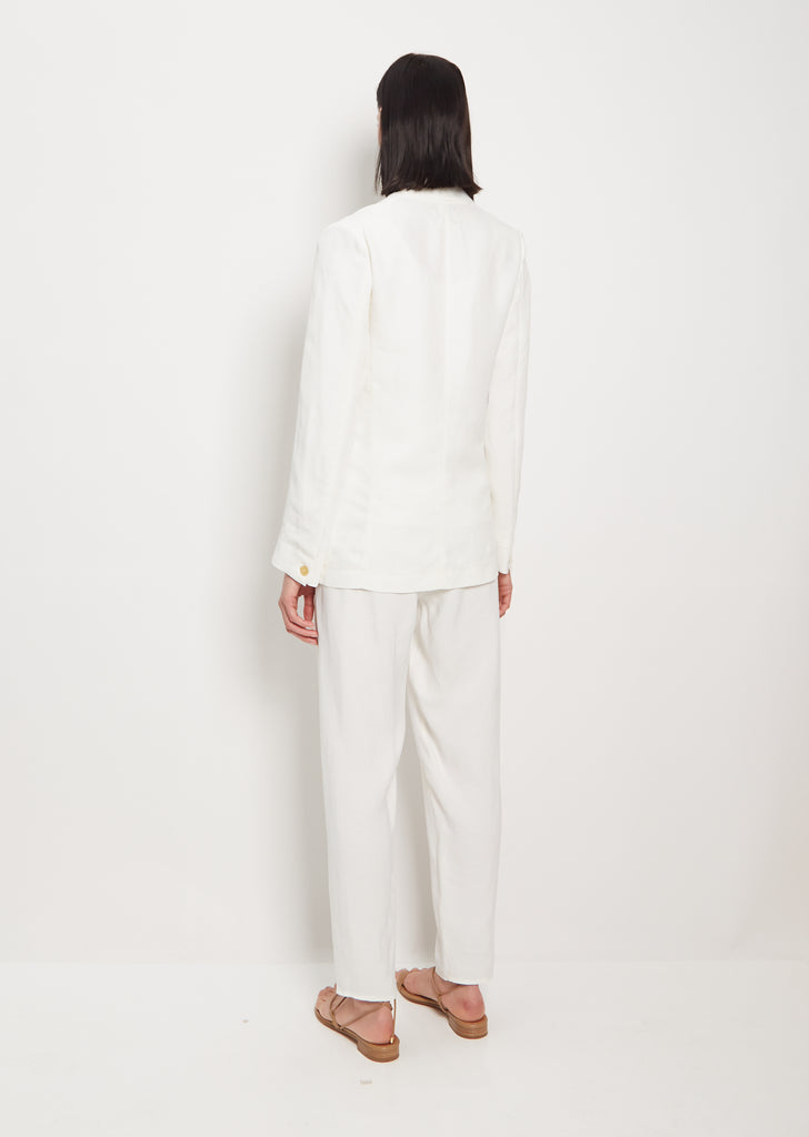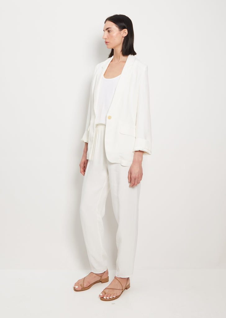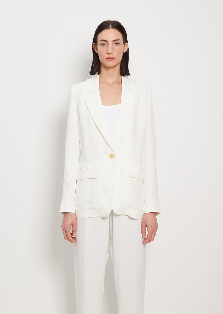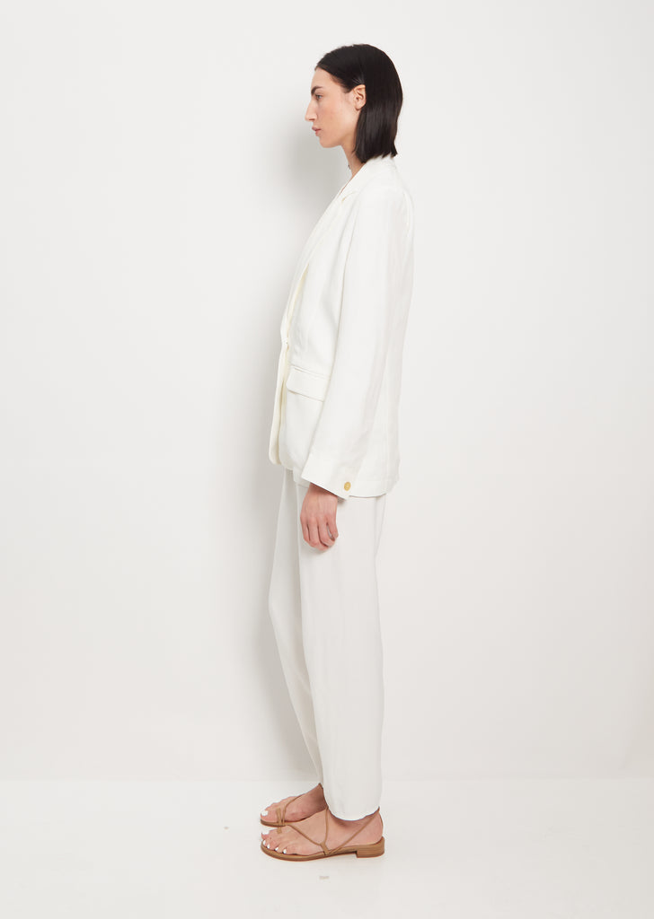 Forte Forte white single breasted blazer with relaxed, straight fit in fluid viscose-linen crepe. Features two hip flap welt pockets and a deep v neckline with notched lapels. Finished with a single button. Comes lined.