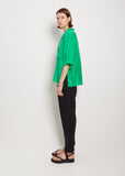 Forte Forte emerald green button-front half sleeve shirt crafted in lightweight silk habotai. Features a single chest pocket and straight hem with side slit detail. Boxy silhouette with a relaxed fit.