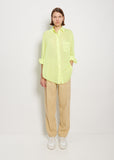 Forte Forte light neon green button down shirt crafted in airy cotton and silk blend. Features a single chest pocket and longer shirttail hem. Slightly dropped shoulders. Straight, relaxed fit.