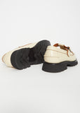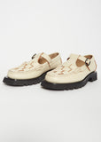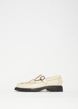 Hereu custard T-bar loafer crafted in Spanish full-grain calf leather. The upper has been hand-sewn using the traditional moccasin construction. Fully lined in a tonal leather with a blown rubber tread sole.