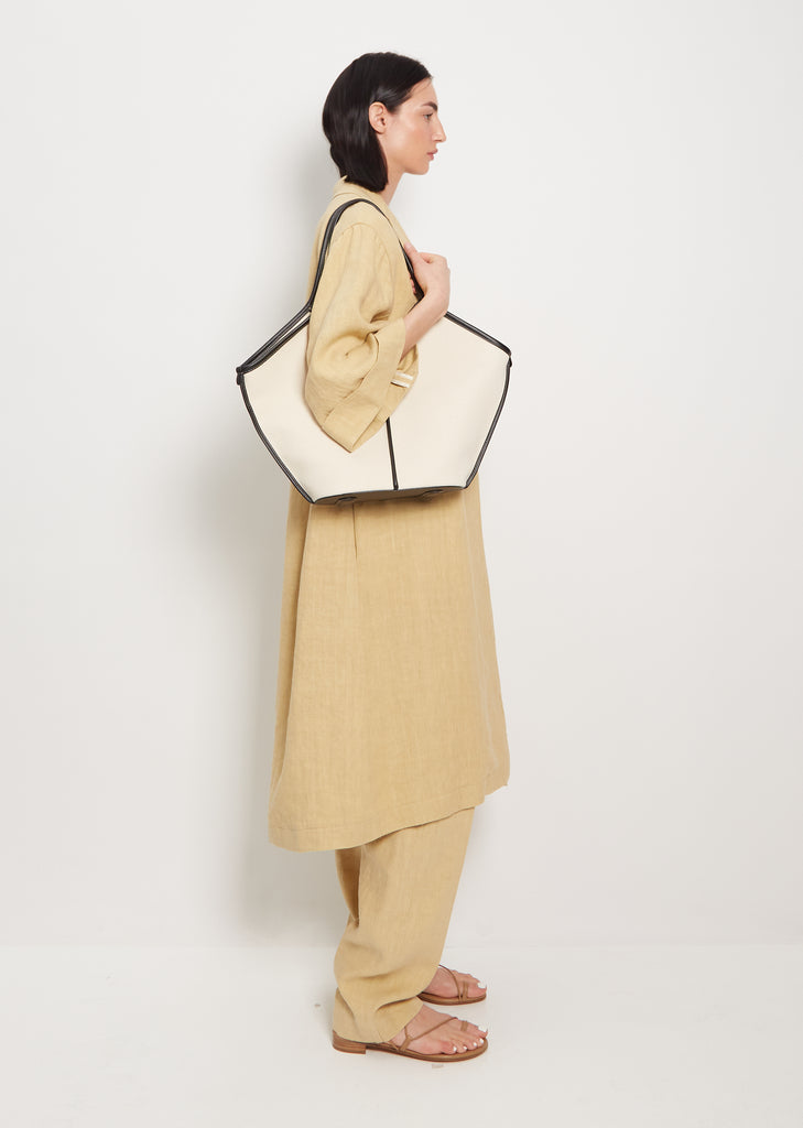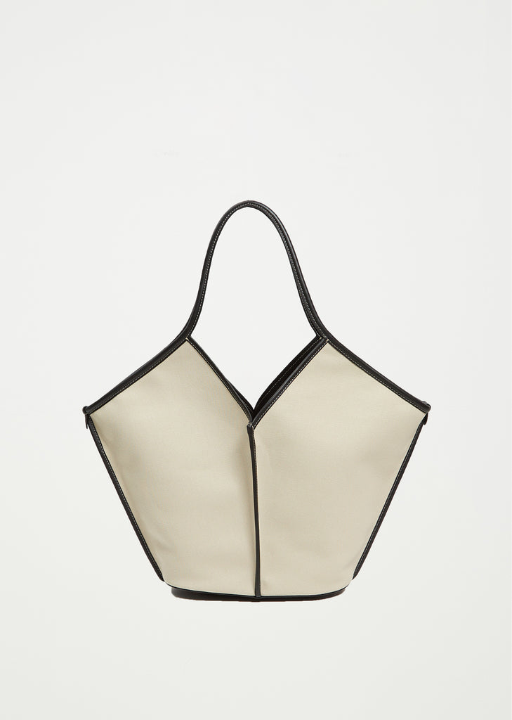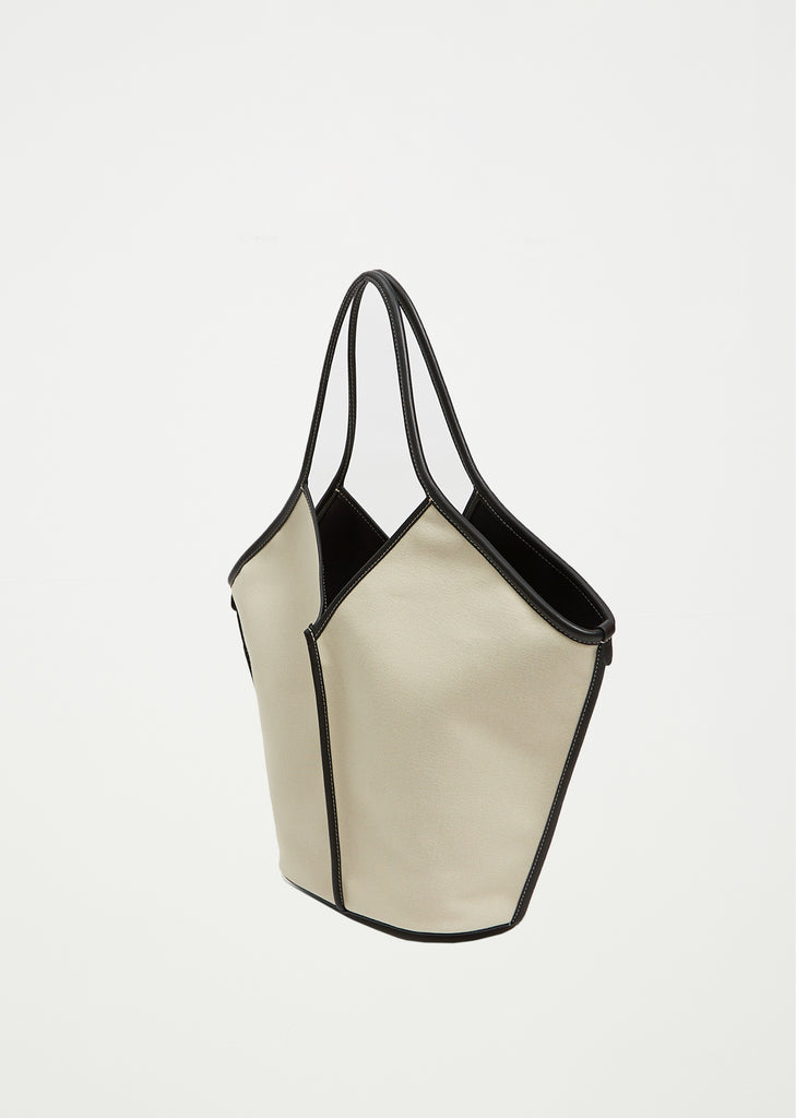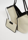 Hereu beige and black organic cotton tote bag edged with smooth leather. Features a zipped pouch and slim top handles that sit over the shoulder.