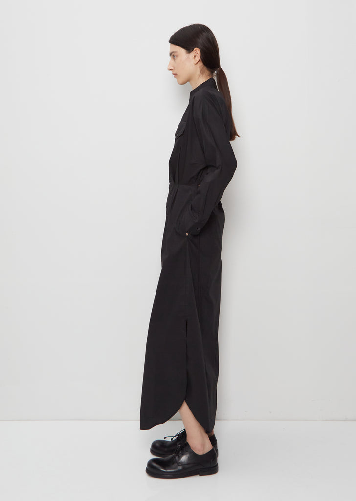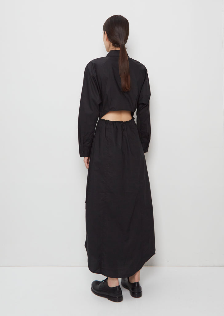 Hope black maxi shirt dress with a back cut-out in dry garment dyed cotton. Features a drawstring detail on the back, two flap pockets at front, a slightly curved hem with side splits, and a button front closure. Unlined.