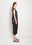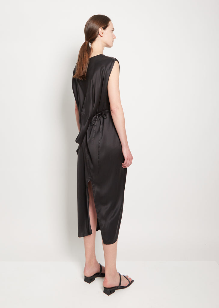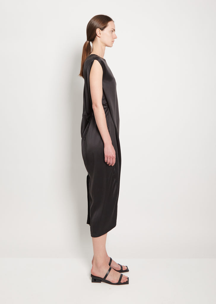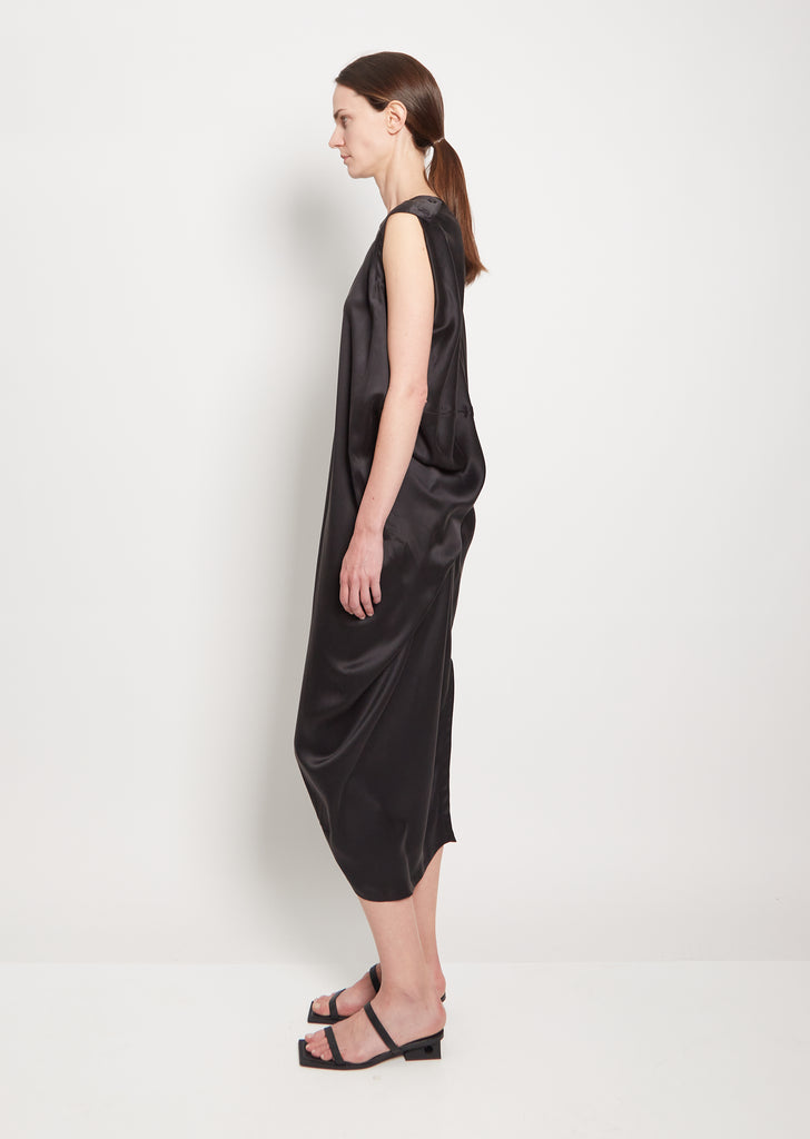 Issey Miyake black long sleeveless dress with a cocoon shape in pure washed silk. Features soft draping, partially concealed thin waist belt, and round neck. Finished with two tonal buttons on shoulder.