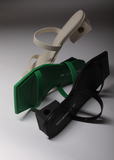 Issey Miyake x United Nude green slip-on sandal with a square toe in soft nappa leather. Features a minimalist two-strap design and a hollowed block heel inspired by "ma”, the Japanese concept of negative space.