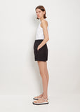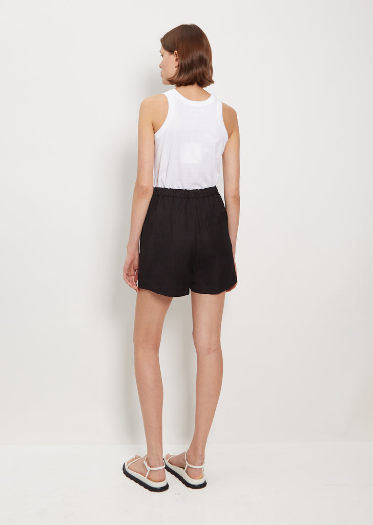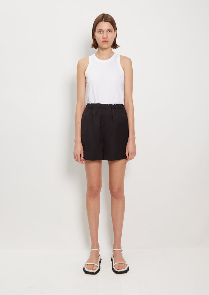 Loulou black shorts with an elasticized waist in smooth crepe. This versatile piece is detailed with a faux fly, concealed side seam pockets, and single back patch pocket. Pull on fit.