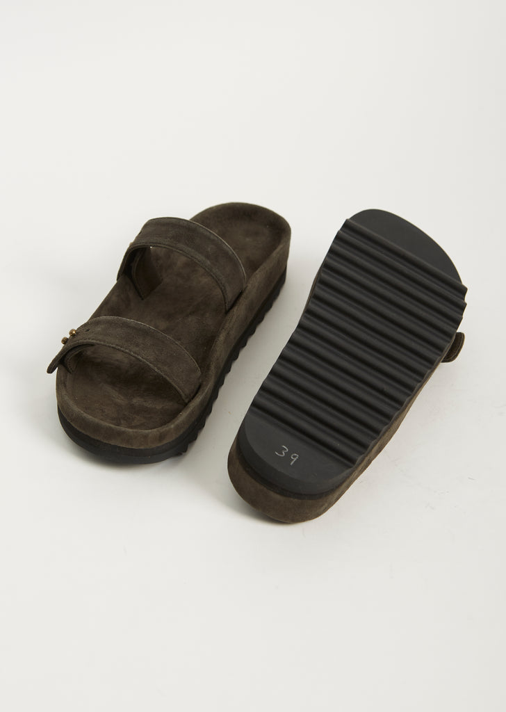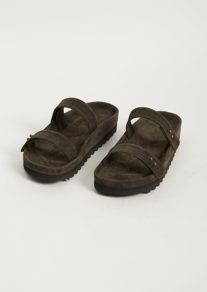 Lauren Manoogian coal two strap sandal with a molded footbed in suede leather. Features an adjustable stud band, tonal suede insole, and treaded sole.