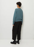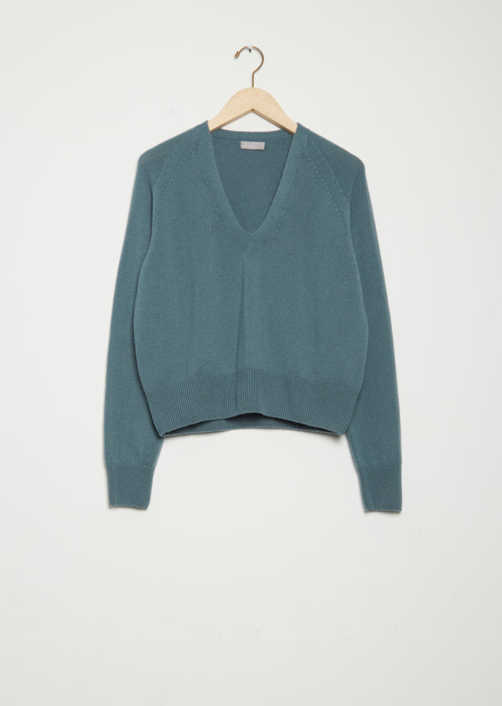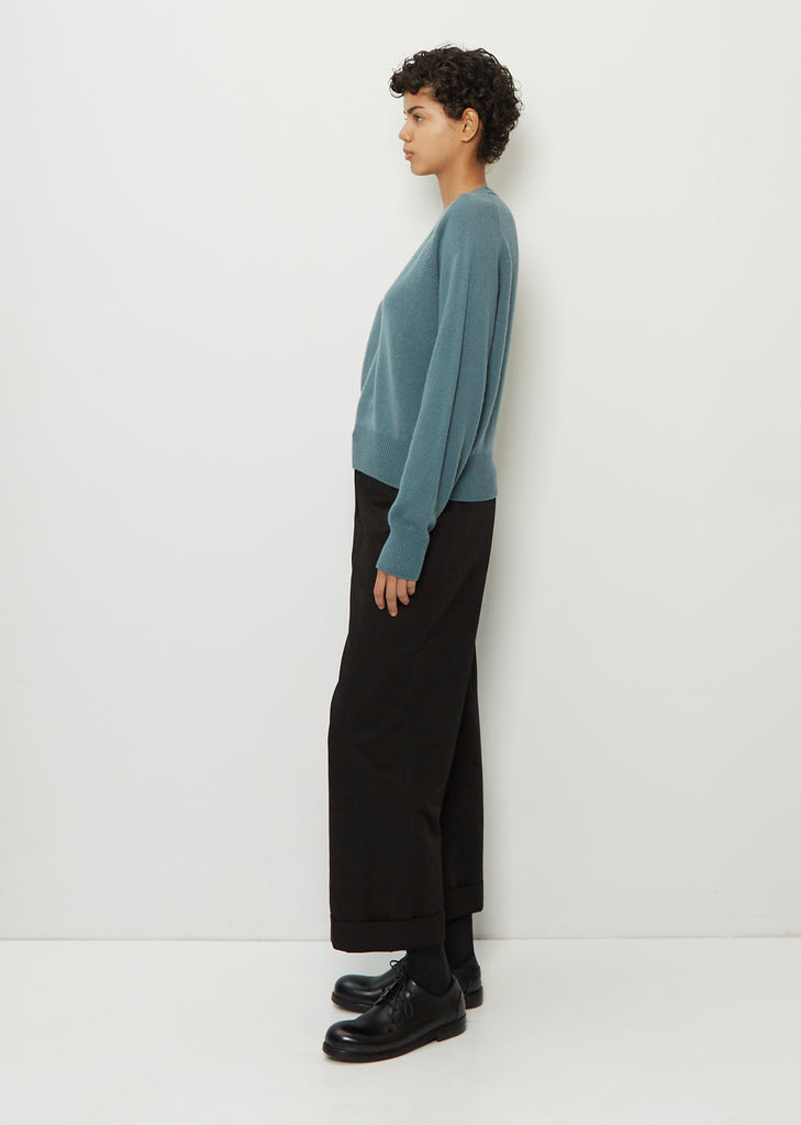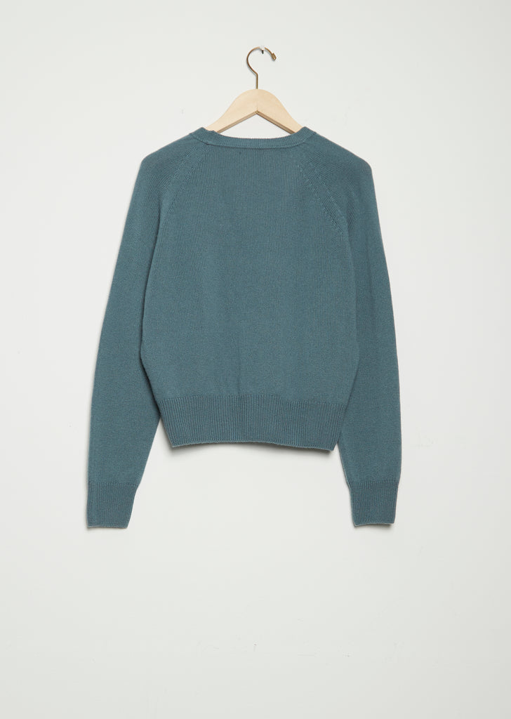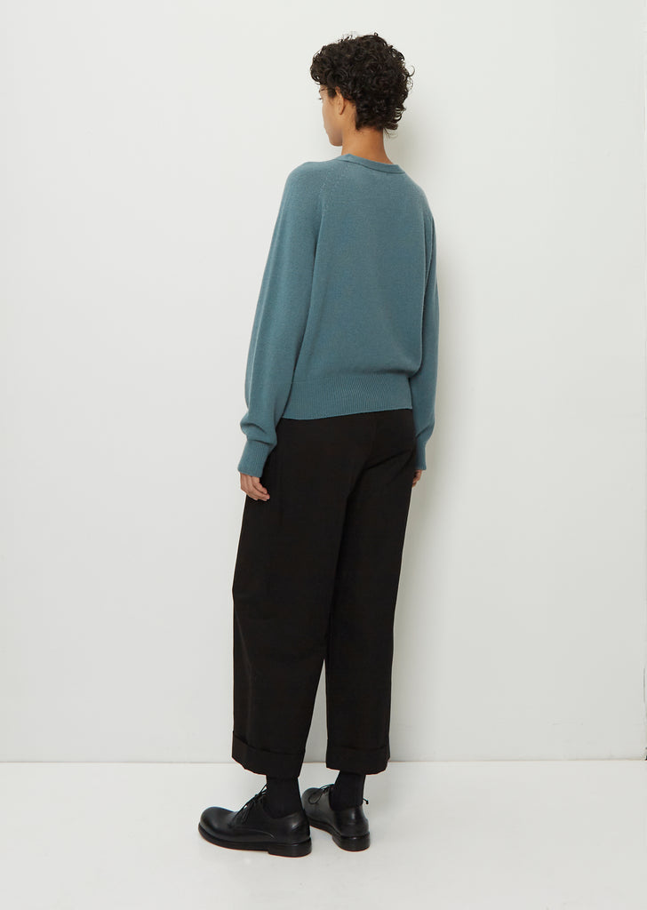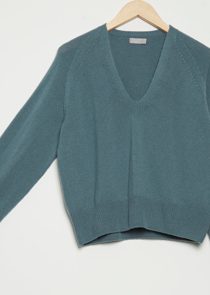 Margaret Howell marine cropped v-neck sweater in pure cashmere knit. Features raglan sleeves, clean finish integral knit along neckline, and rib trim finish along cuffs and hem. Relaxed, boxy fit.