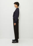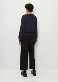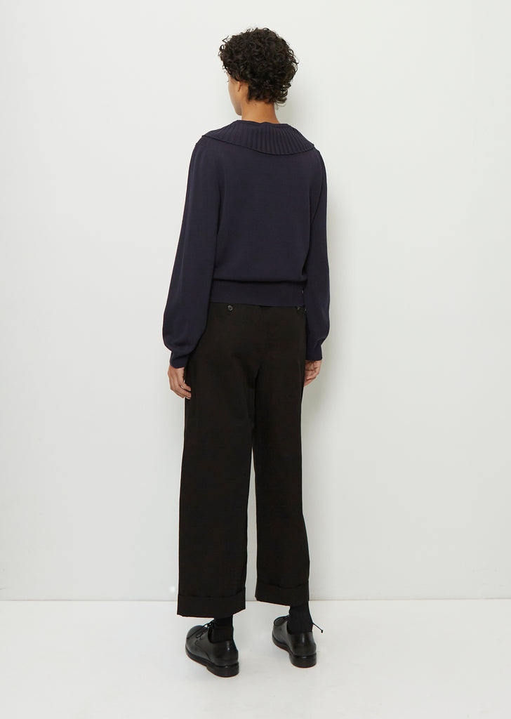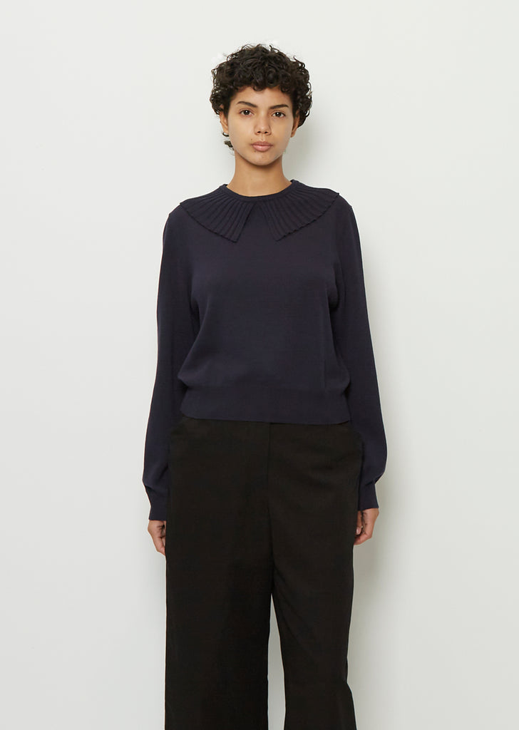 Margaret Howell navy sweater with fluted collar in extra fine merino wool knit. Features a round neck, ribbed split front collar, and rib trim finish along cuffs and hem.