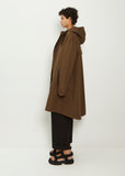 Margaret Howell bark A-line parka with hood in densely woven, rainproof cotton. Features draw cords on hood, angled zippered pockets, and zip with two snap fastener closure. Unlined. Relaxed fit.