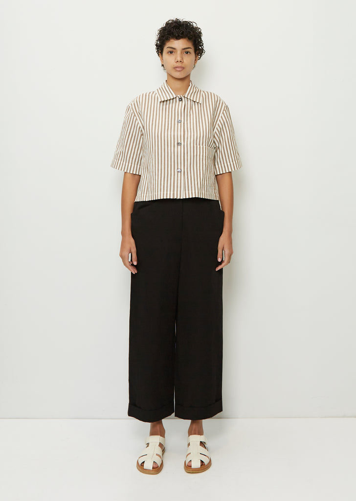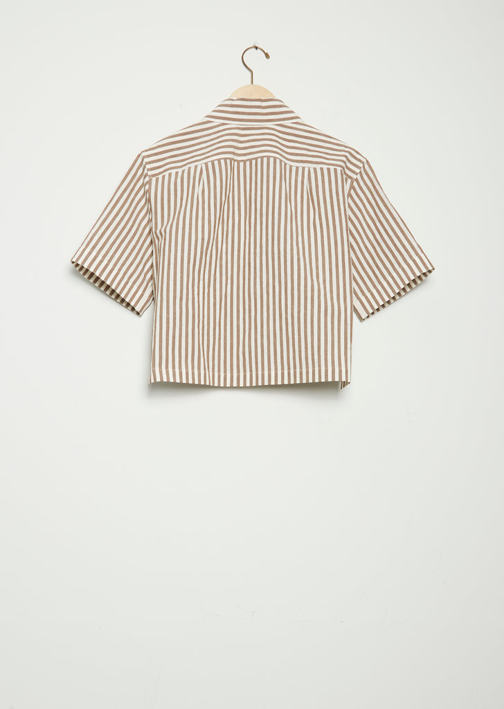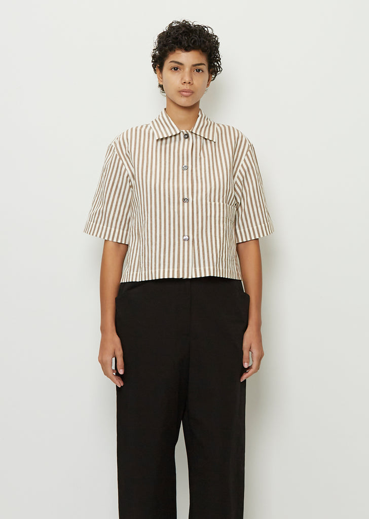 Margaret Howell cinnamon and off-white striped cropped shirt in structured cotton linen. Features a chest patch pocket, spread collar, straight hem, and button front closure.