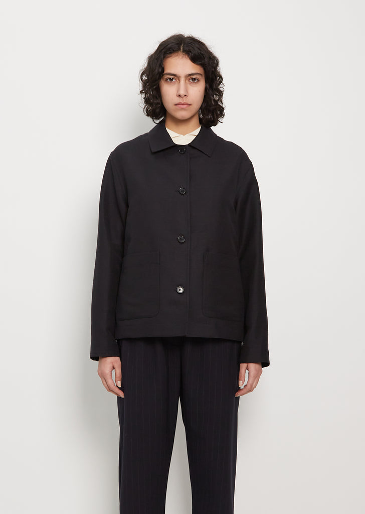 Margaret Howell ink slightly cropped over-shirt with a spread collar in linen wool blend. Detailed with hip patch pockets and a tonal button closure. Boxy fit.