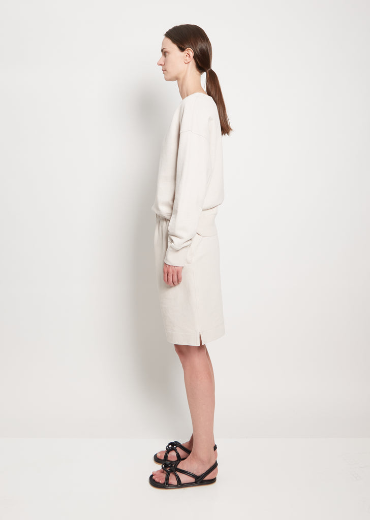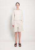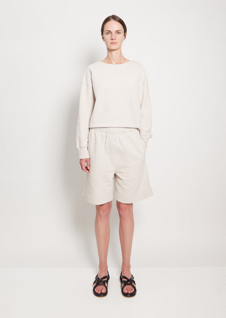MHL by Margaret Howell knee length sweat shorts in soft organic jersey cotton. Features an elasticized waist, angled side pockets, and interior waist drawcords.