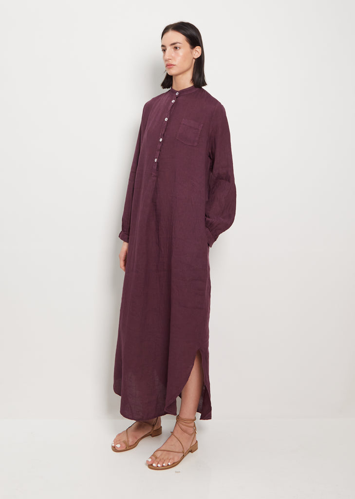 Massimo Alba plum full length kaftan dress in lightweight linen. Features a deep v-neck opening with a small mandarin collar, welt side pockets, one patch pocket and long side slits. Relaxed, loose fit. Comes unlined.
