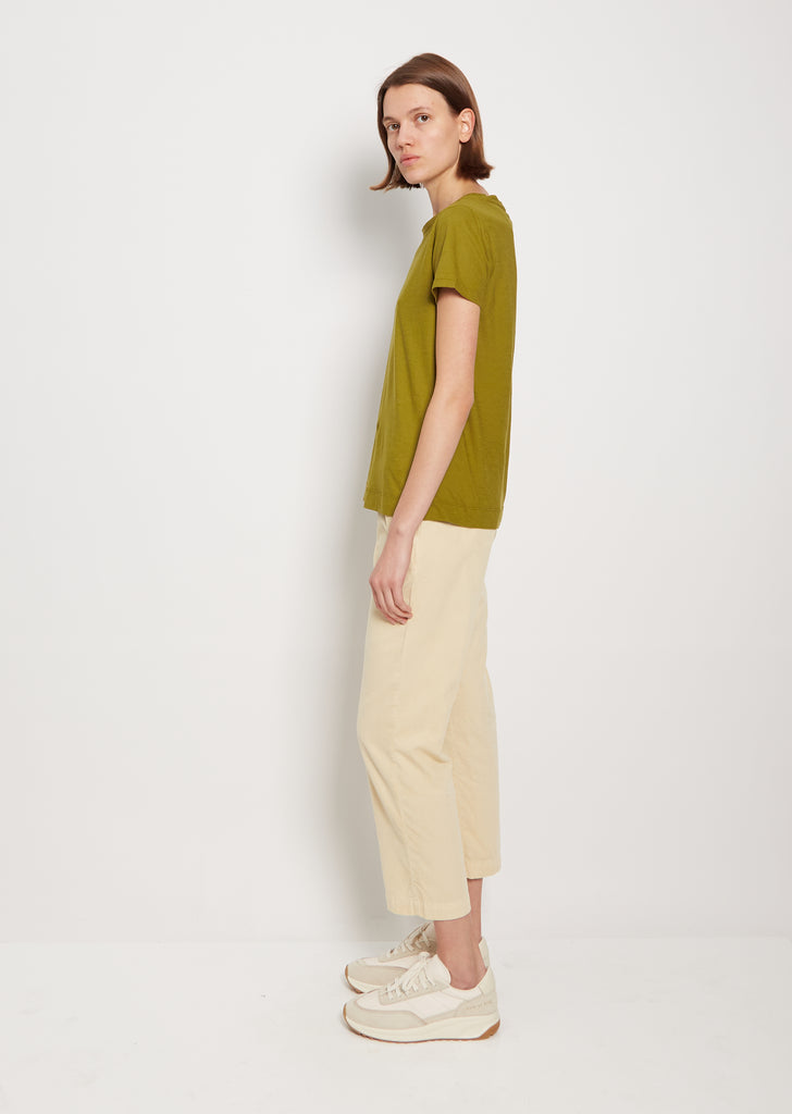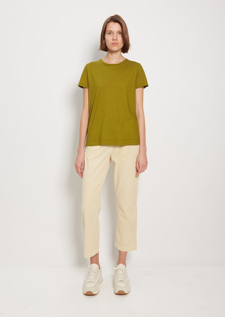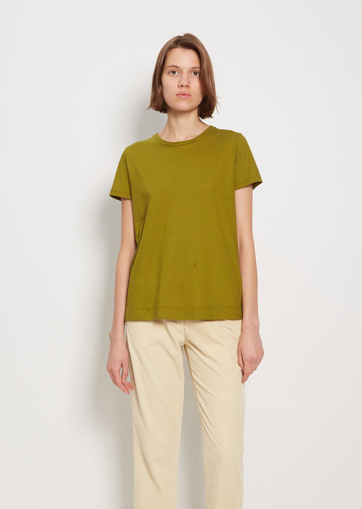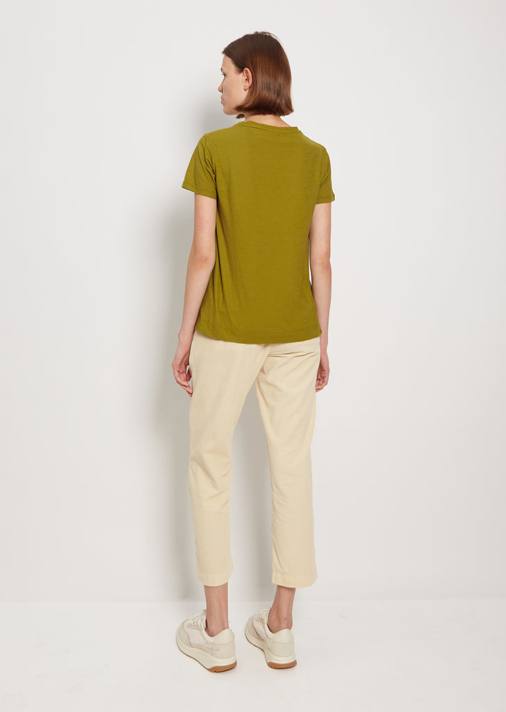 Massimo Alba gaucamole tee with a round neck and wide hem with small side slits. Straight fit.