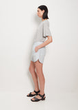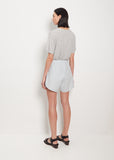 MoniqueVanheist light blue boxer style shorts with curved side splits in crisp lightweight cotton linen. Concealed side seam pockets. Finished with an elasticized waist.