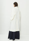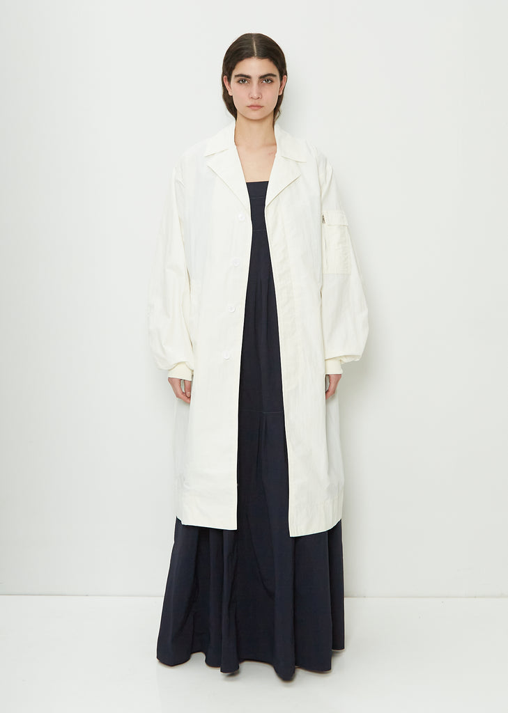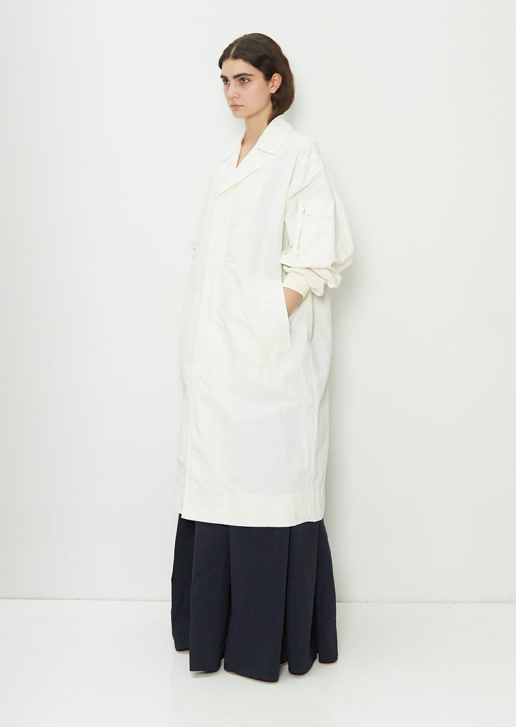 Plan C butter coat with notched lapels in technical nylon. Features ruched sleeves with zippered arm pocket, button front closure, and side pockets. Unlined. Oversized fit.
