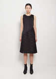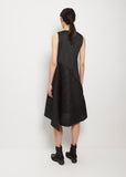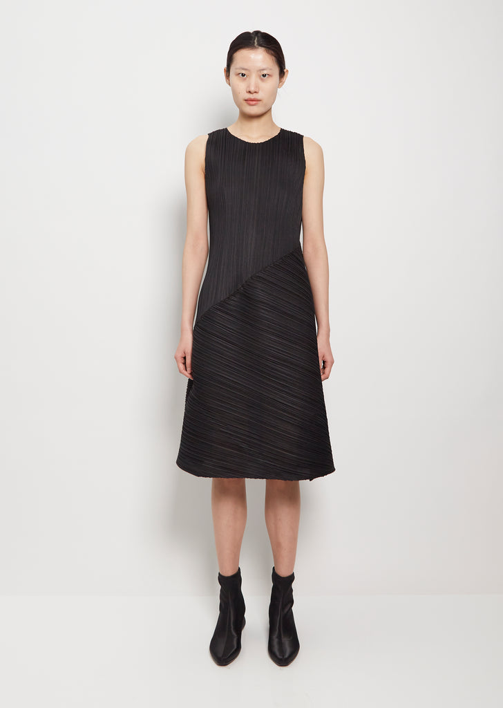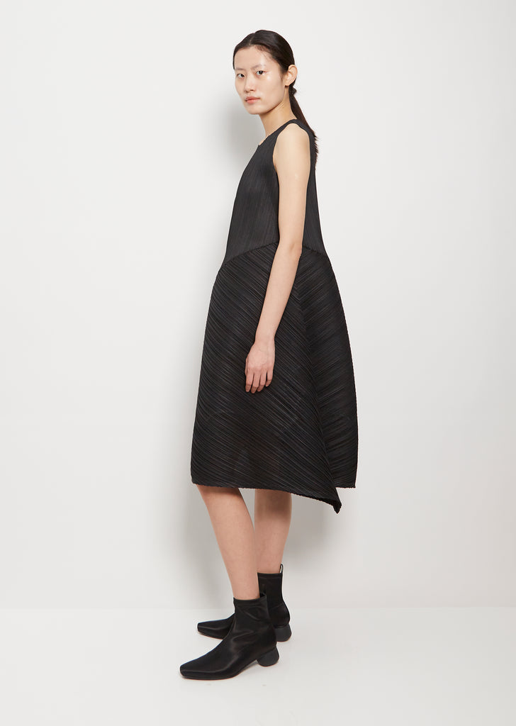 Pleats Please black A-line dress with a wide neck and asymmetric waist line in pleated technical chiffon. Pulls over.