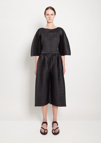 Pleats Please black cropped pants with an exaggerated wide leg in horizontal pleated technical chiffon. Features an elasticized waistband and concealed side pockets.