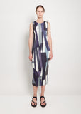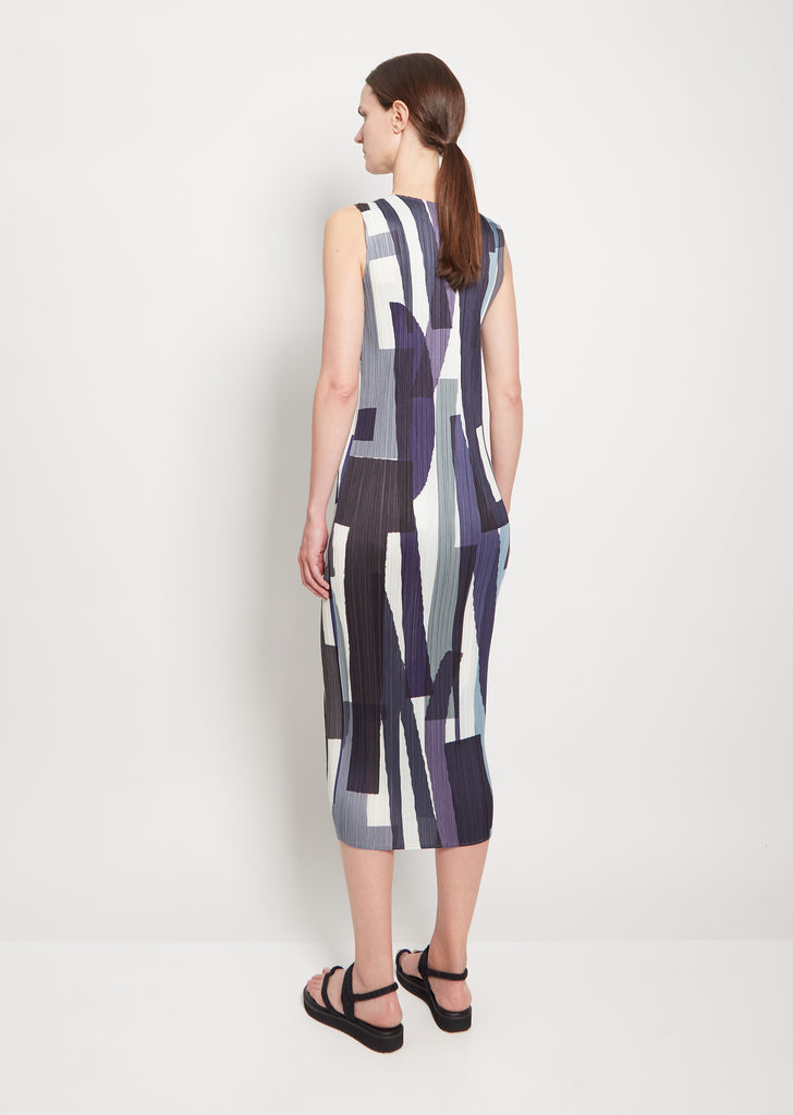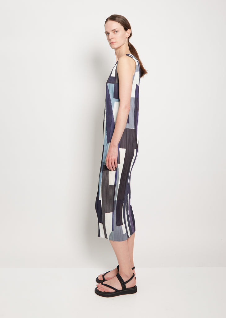 Pleats Please monochrome sleeveless pleated dress features a straight shape and scoop neck in pleated technical chiffon.  Features a graphic print that reveals a concealed Pleats Please logo in enlarged lettering, celebrating the 30th anniversary of the brand.