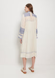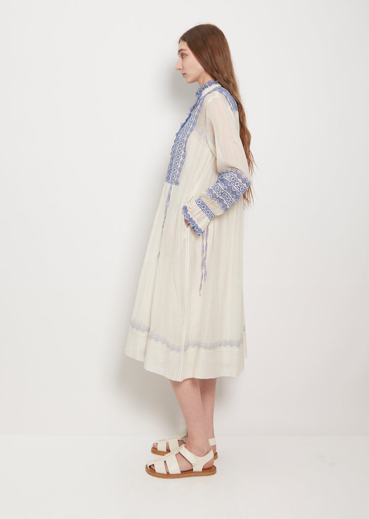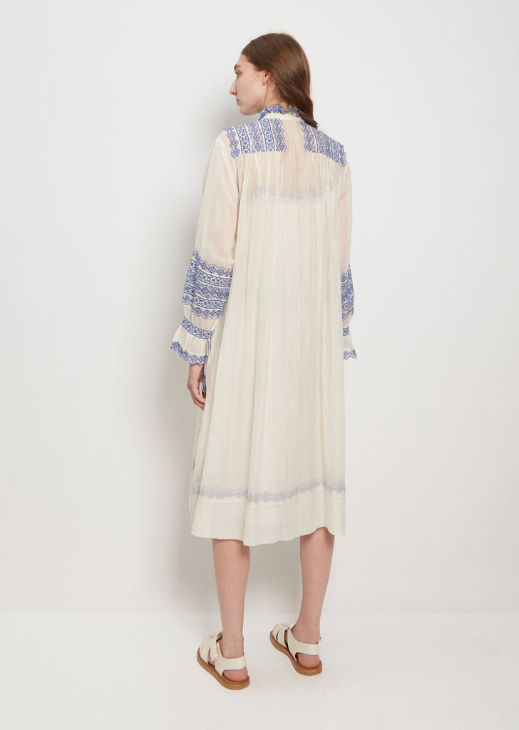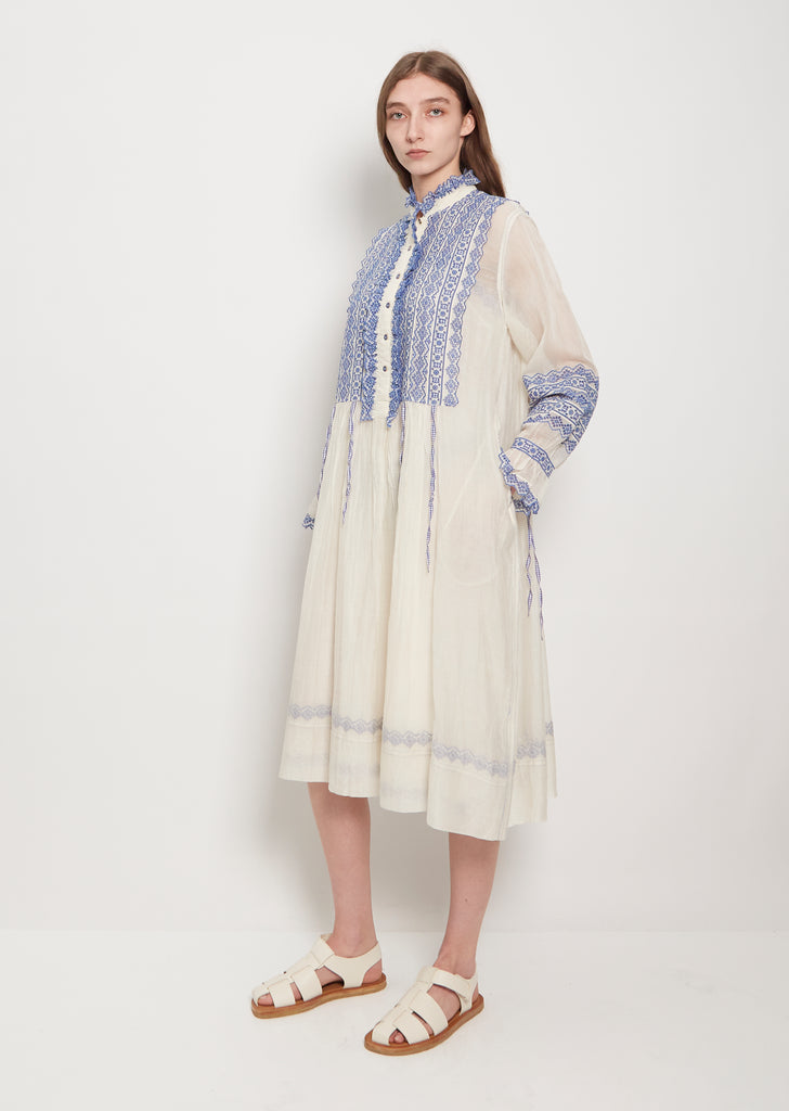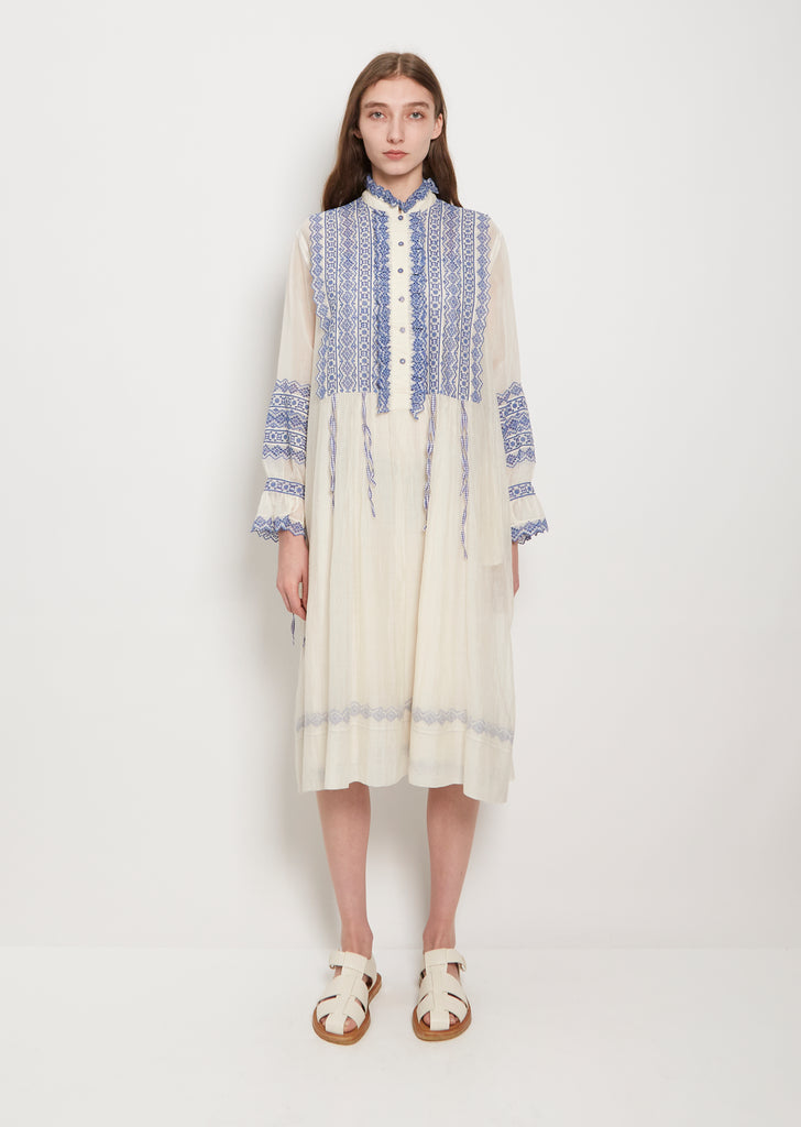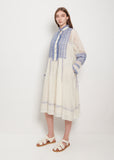 Péro long sleeve dress with embroidered three-quarter button front bodice in cotton silk blend. Features a three-quarter button front bodice with stand collar, adjustable drawstrings at cuffs and invisible seam pockets. Lined.