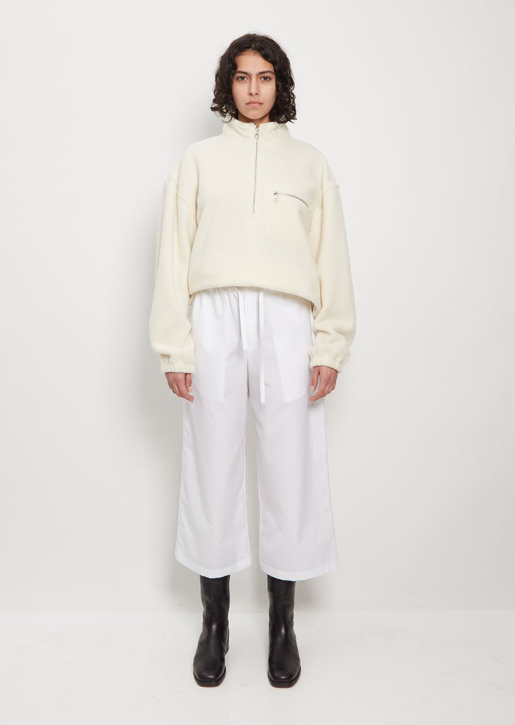 Rier white cropped, wide leg trouser with a gathered waist in crisp cotton poplin. Features waist drawcords to adjust the fit, single back patch pocket, and concealed side pockets. Finished with a concealed zip with single small exposed button at top. These trousers come unlined.