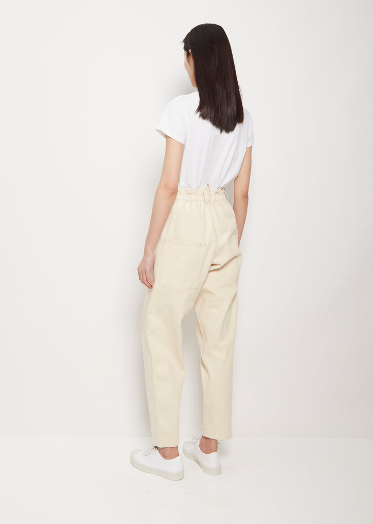 Toogood raw denim tapered leg jeans with high-rise fit in cotton denim. Features angled side pockets, two rear patch pockets, clean front waistband and elasticized back. Zip with button fastening closure.