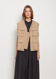Toujours camel vest with large patch flap pockets in technical fabric with a crinkled effect. Features a v-neckline, clean concealed button placket front, and back vent. This vest has a boxy fit and comes unlined.