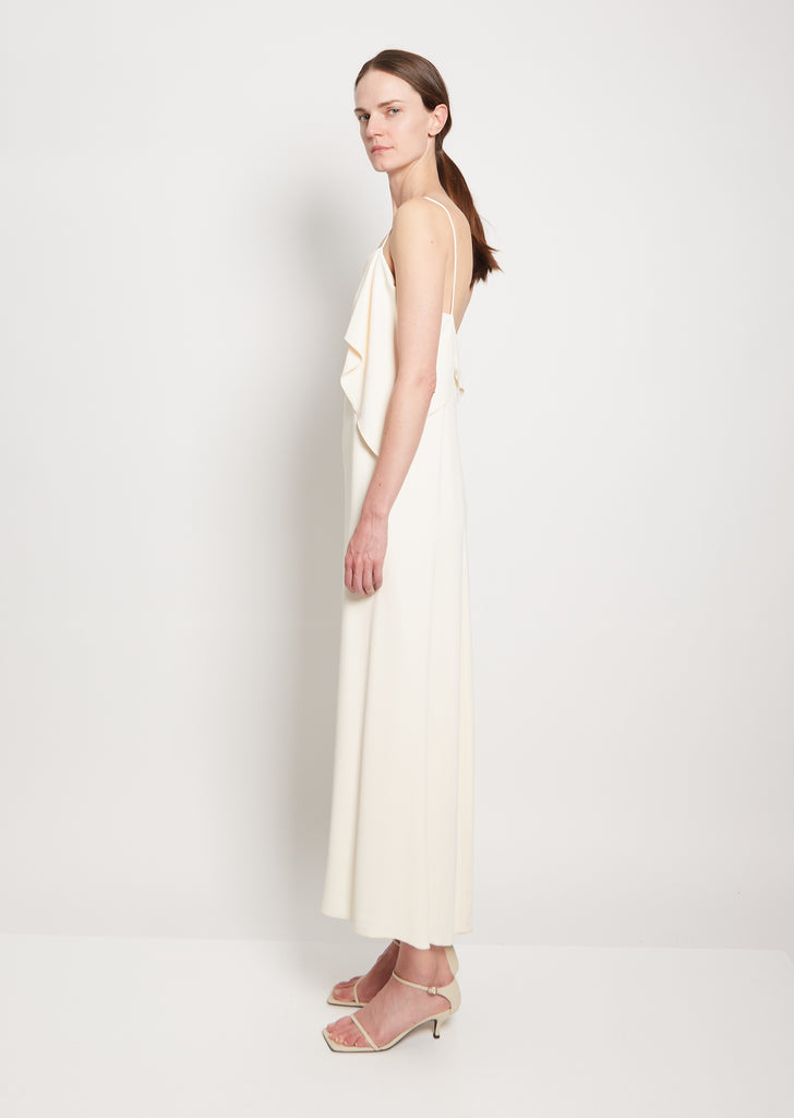 Totême blush tone cami dress with foldover neckline that drapes along the sides and dips at the back in washed silk. Features slim straps and an ankle length hem.