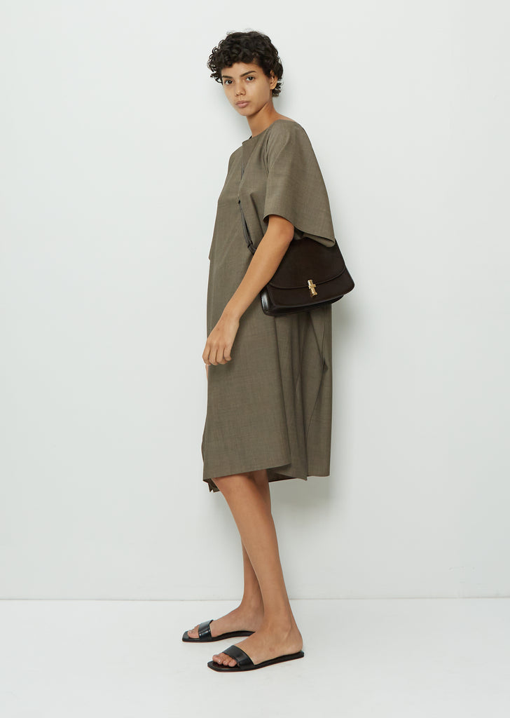 The Row Sofia handbag in brown box calfskin leather with crossbody strap and gold-toned lock closure. Interior zippered pocket. Fully lined in leather.