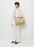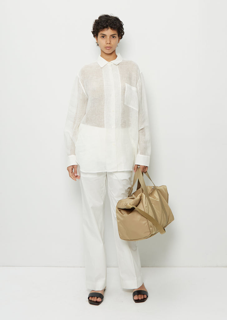 The Row beige spacious weekender duffle bag in lightweight sateen nylon with expandable sides, top zippered closure, adjustable shoulder strap, and interior zipper pocket. Fully lined in self.