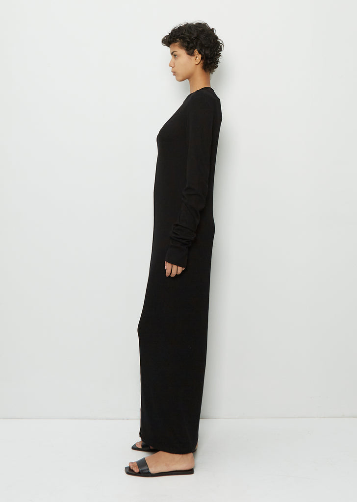 The Row black full length dress with a round neck in soft fluid viscose knit. Features a front seam detail and extra long sleeves. Relaxed fit.