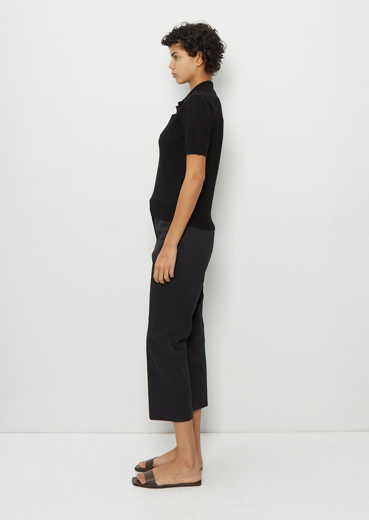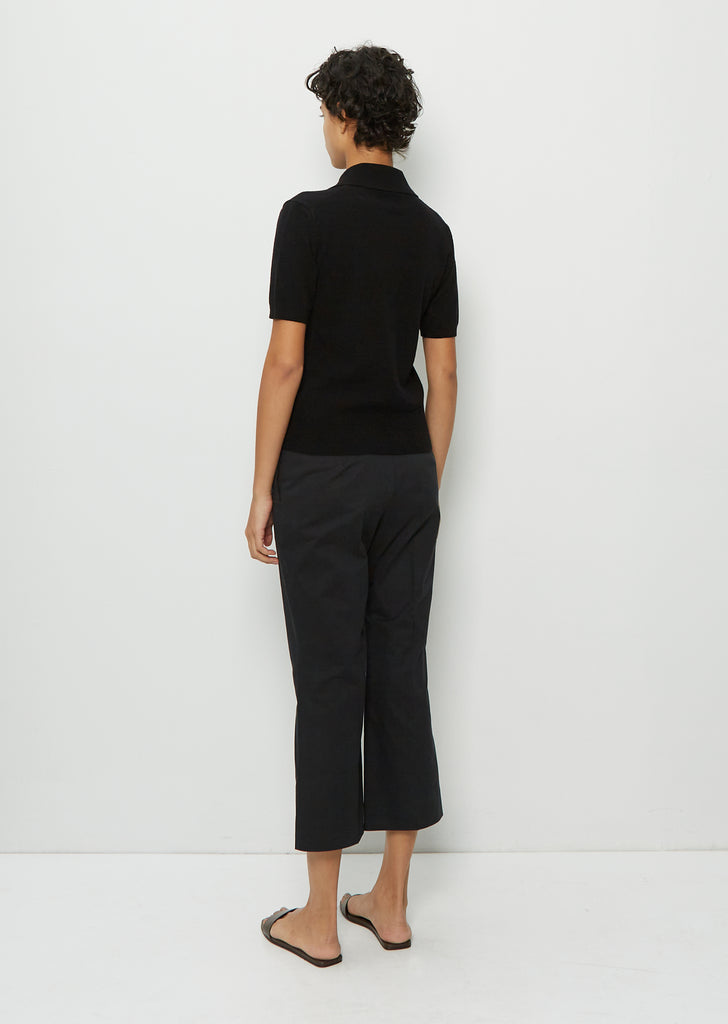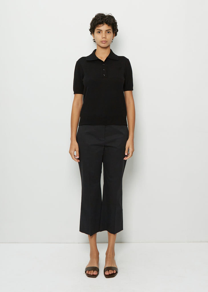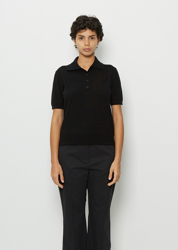 The Row black top with polo collar in pure cashmere knit. Features a three quarter button front and front chest welt pocket. Relaxed fit. Pulls over.
