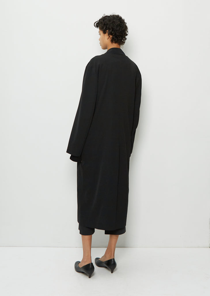 The Row black double breasted coat with a wide notched lapel in fluid viscose wool blend. Features flap pockets, single button closure, and back vent. Lined in silk. Relaxed fit.