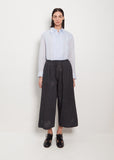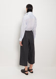 Y's by Yohji Yamamoto grey cropped wide leg trousers with an elasticized waist in cotton and flax linen blend. Features welt side pockets and single oversized back patch pocket. Finished with a concealed zip fly with button at top and interior waist drawcord to adjust fit.