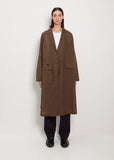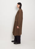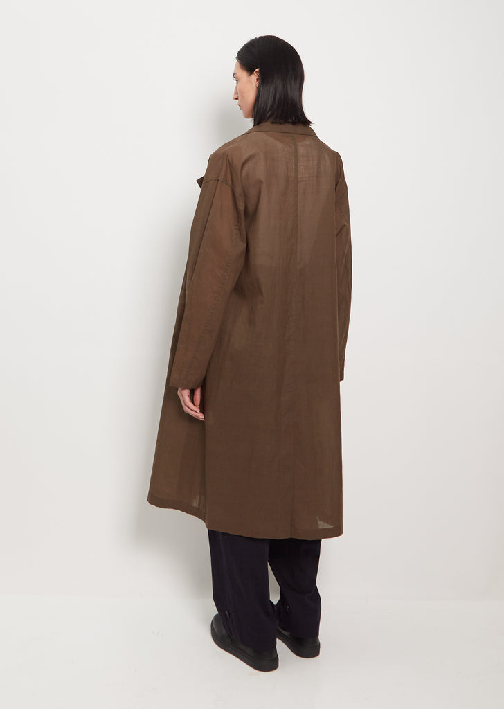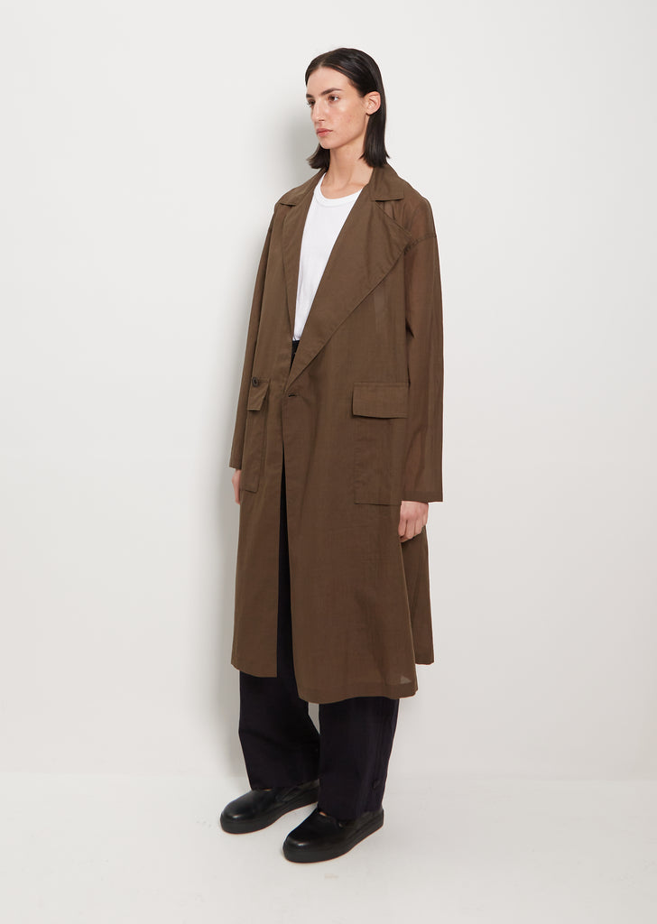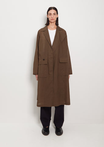 Y's by Yohji Yamamoto khaki single breasted coat with asymmetric notched lapels in lightweight linen like fabric. Features two oversized flap patch pockets and single button closure. Comes unlined.