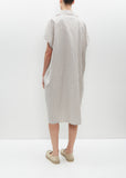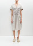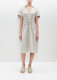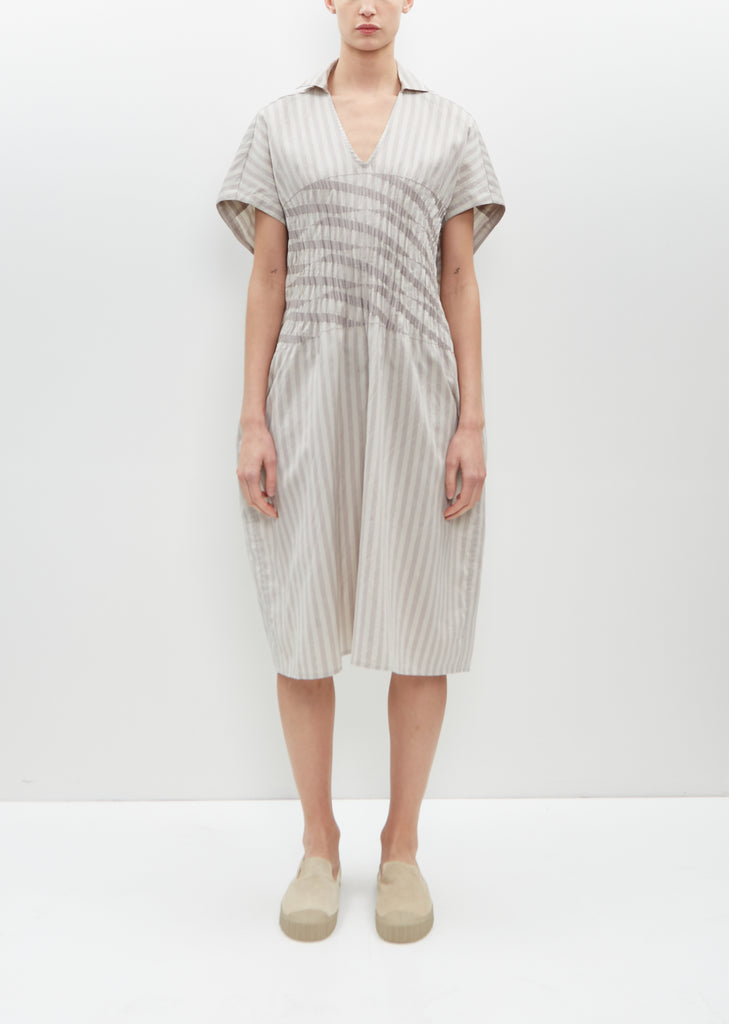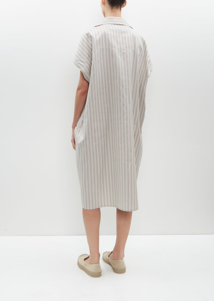 6397 white and grey stripes mid length kaftan dress with a pleated panel and embroidered details at front in cotton and silk blend twill. Features an open collar, V-neckline and two side seam pockets. Relaxed fit.