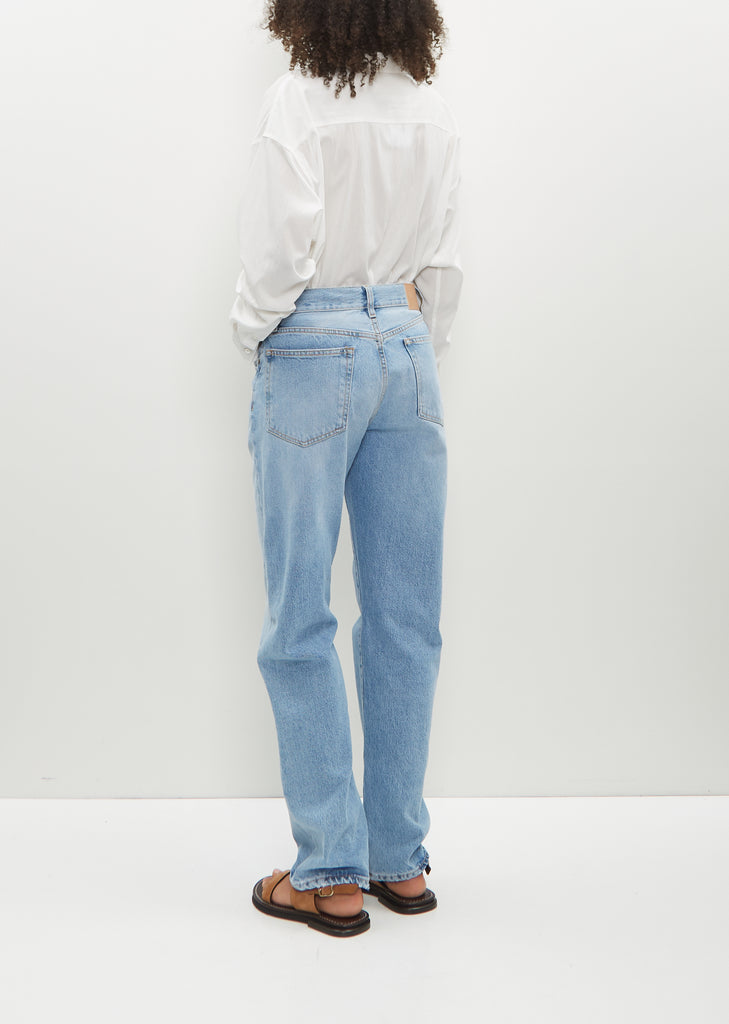 6397 signature relaxed jean with full-length, straight legs in washed light blue cotton denim. Features a 5-pocket construction and silver-tone hardware. Button and zip-fly fastening.