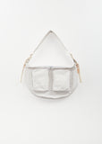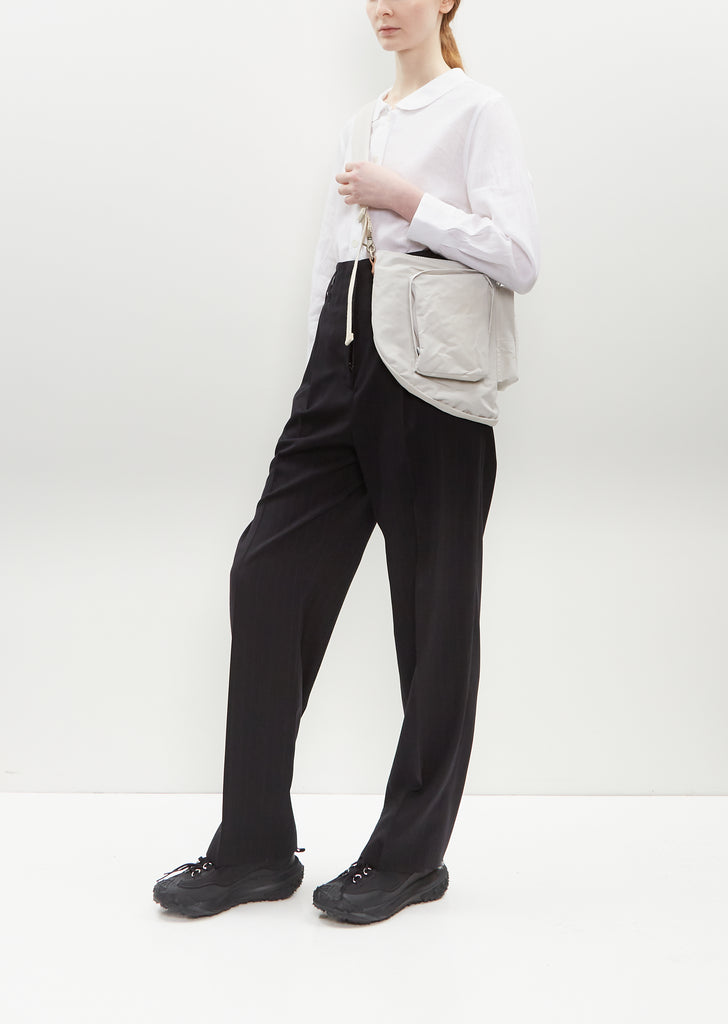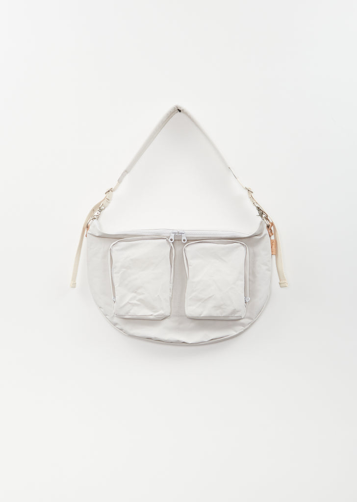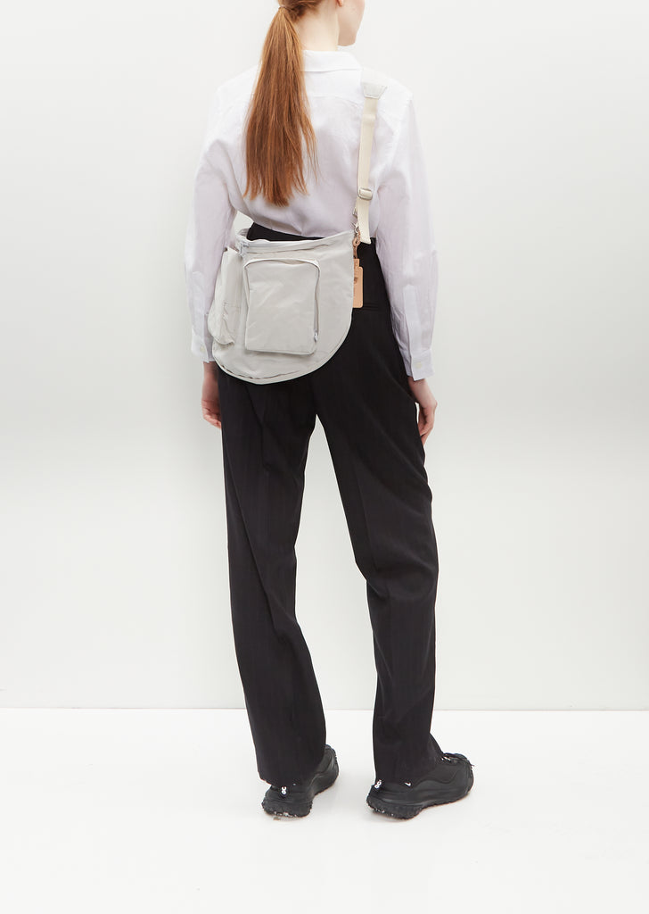 Amiacalva crossbody bag with an adjustable and detachable webbing strap in a soft cotton and nylon blend cloth. Features two exterior zip-around front pockets and a top zipper closure. Finished with tonal zippers. Comes unlined.