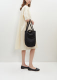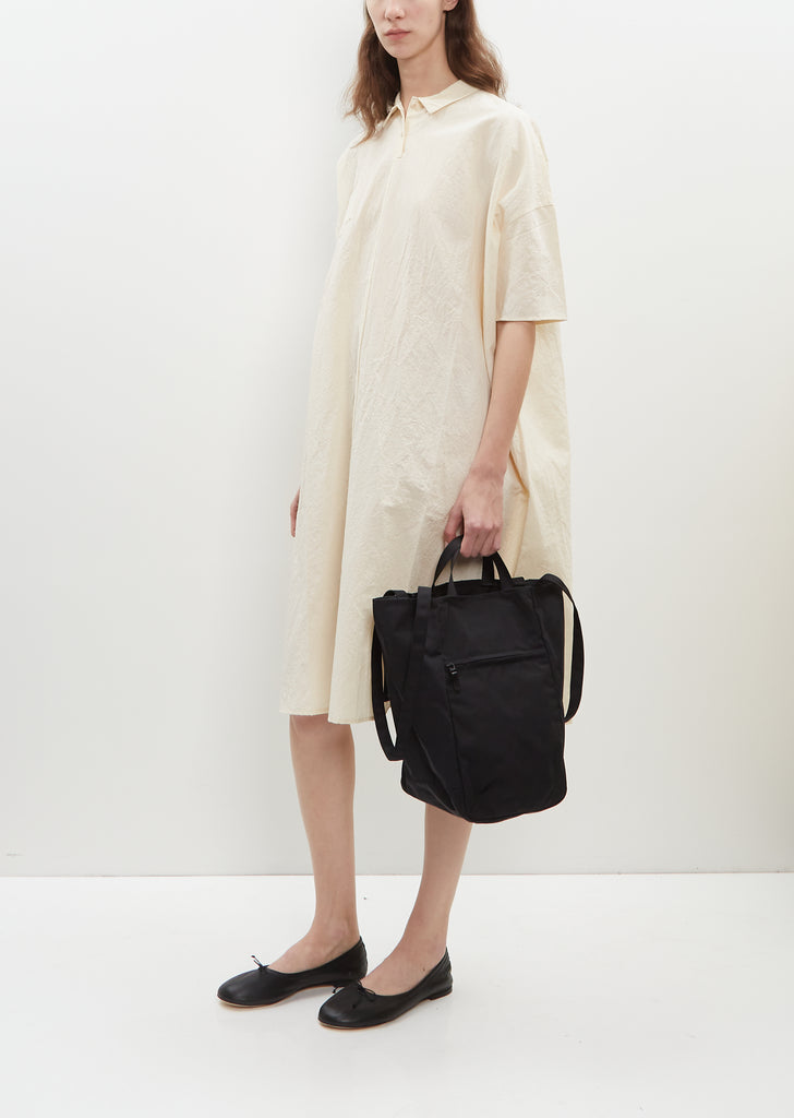 Amiacalva black tall medium tote bag with four handles in nylon gabardine. Features top handles, shoulder straps, two interior slip pockets, two exterior zip pocket, and gusseted base and sides. Comes unlined.