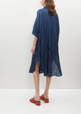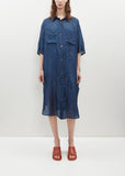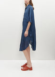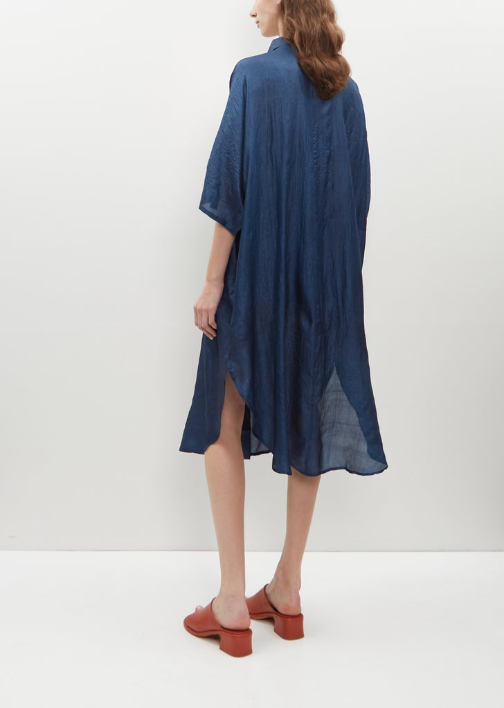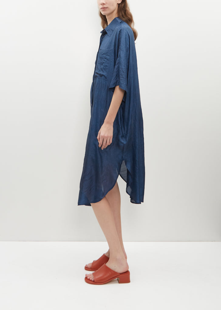Anaak eclipse blue short sleeve shirt dress in lightweight Tussar raw silk. Features a longer short sleeve on a slightly dropped shoulder, double patch pockets at front and curved shirttail hem. Finished with shell buttons down front. Comes with a short slip dress underlay.
