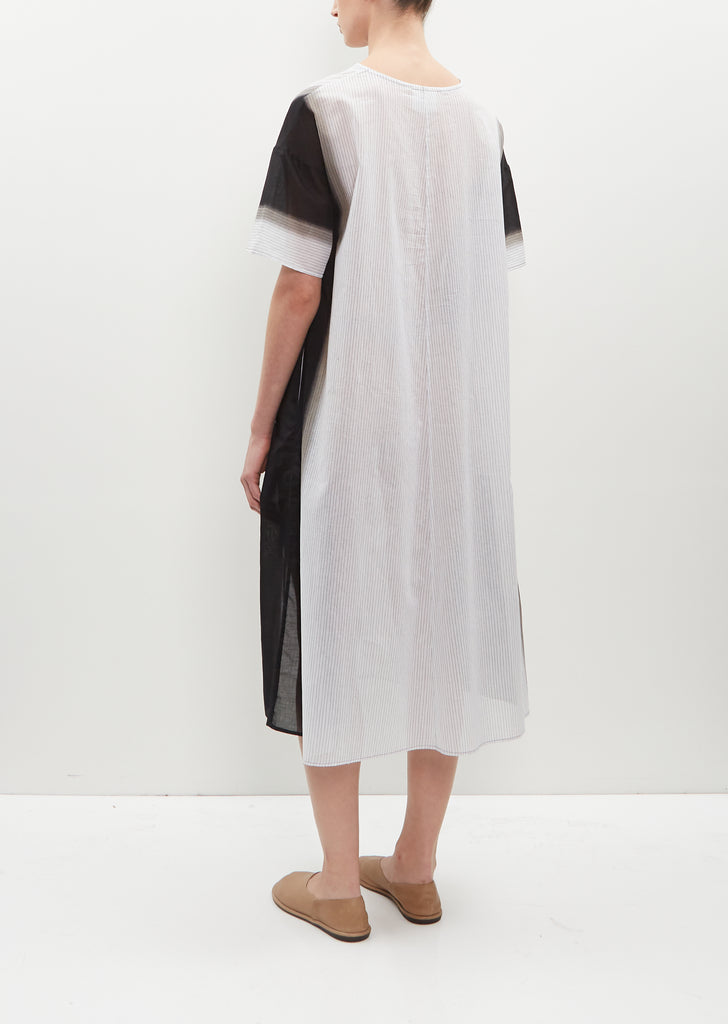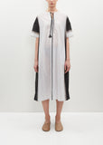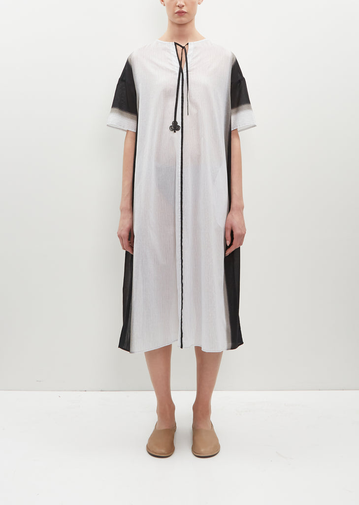 Crafted in Japan, Antipast short sleeve caftan dress in white stripes and contrast black borders at sleeves and side panels in airy cotton. Features self ties at front neckline with asymmetrical embroidered motif detail at one end. Hidden side pockets. Easy, popover fit.