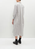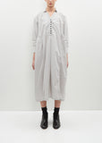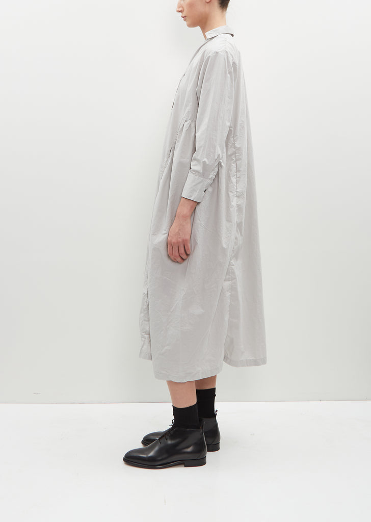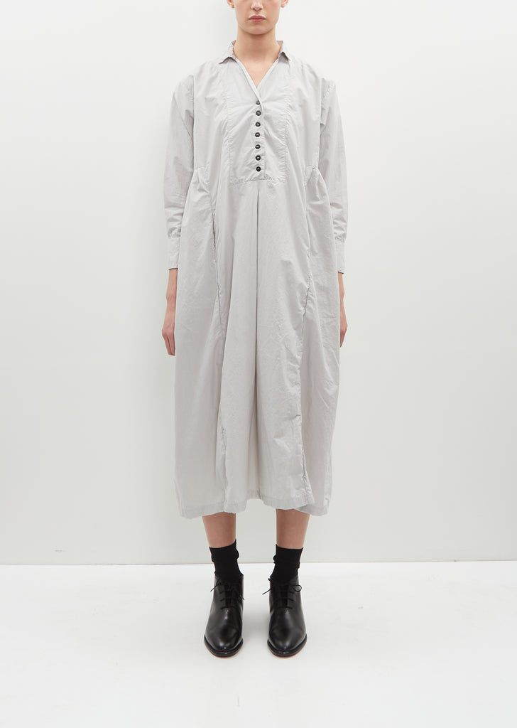 Bergfabel cement grey collared dress with buttoned front and pleated side panels in washed cotton. Features a V-neckline, cropped cuffed sleeves and concealed side seam pockets. Easy, popover fit.