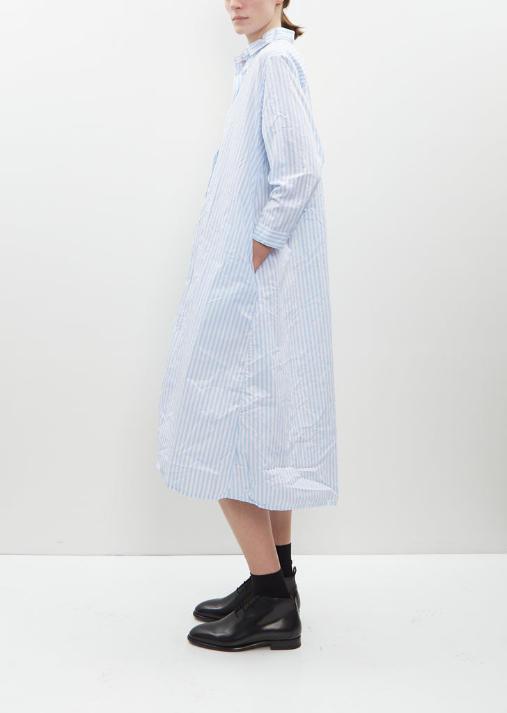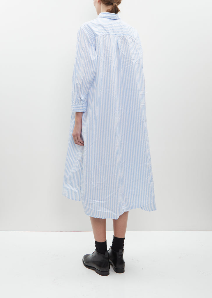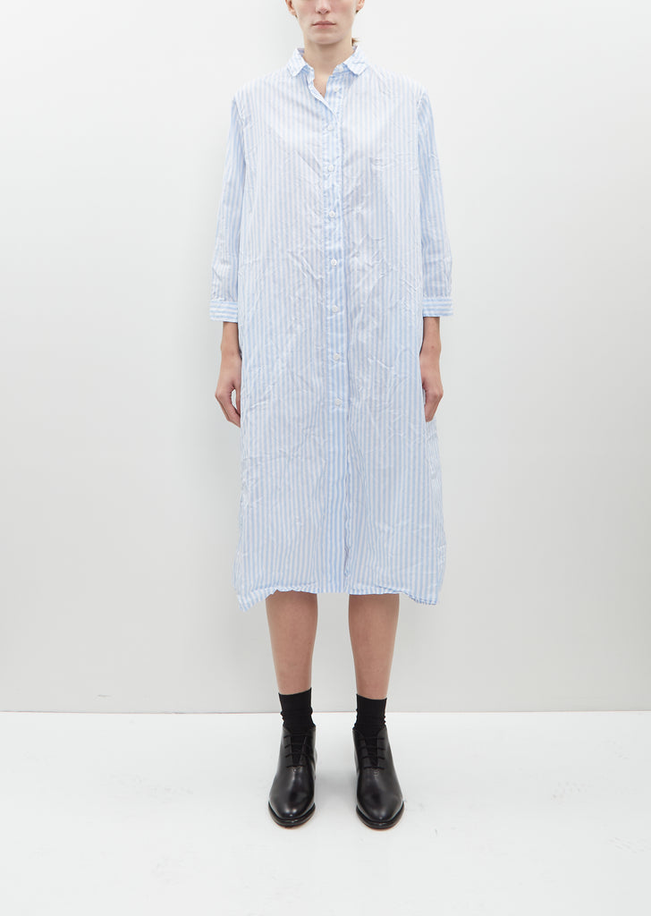 Bergfabel blue and white stripe shirt dress with cropped sleeves in washed cotton. Features a shirt collar, cuffed sleeves and concealed side seam pockets. Box pleat detail at back and finished with shell buttons at front. Subtle A-line cut with a relaxed fit.