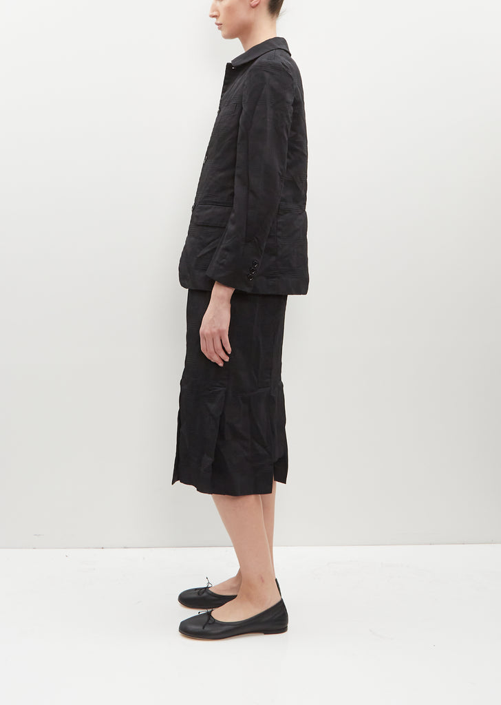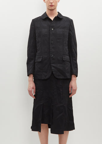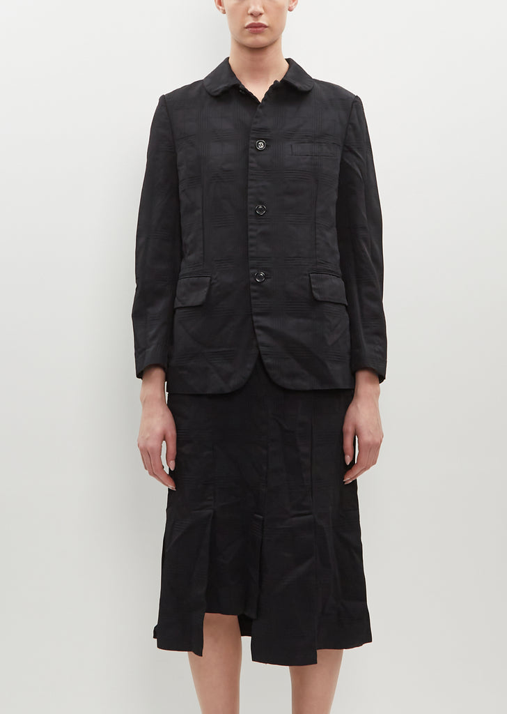 Comme des Garçons Comme des Garçons black single-breasted blazer jacket with a cub collar and flap pockets in check pattern technical gabardine. Features a single welt chest pocket and back vent. Tonal button front closure and buttoned sleeves.